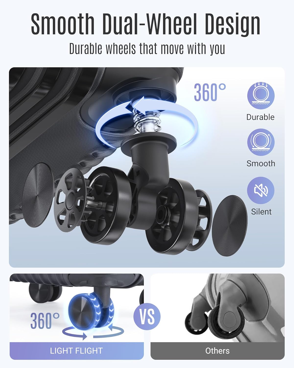 - Extremely Smooth: Equipped with premium 360° dual-spinner wheels featuring soft TPU construction and lubricated ball bearings, these suitcases glide silently and smoothly in any direction. The stable dual-wheel system ensures effortless maneuverability through crowded airports or city streets, making this 3-piece luggage set ideal for long trips and business travel.