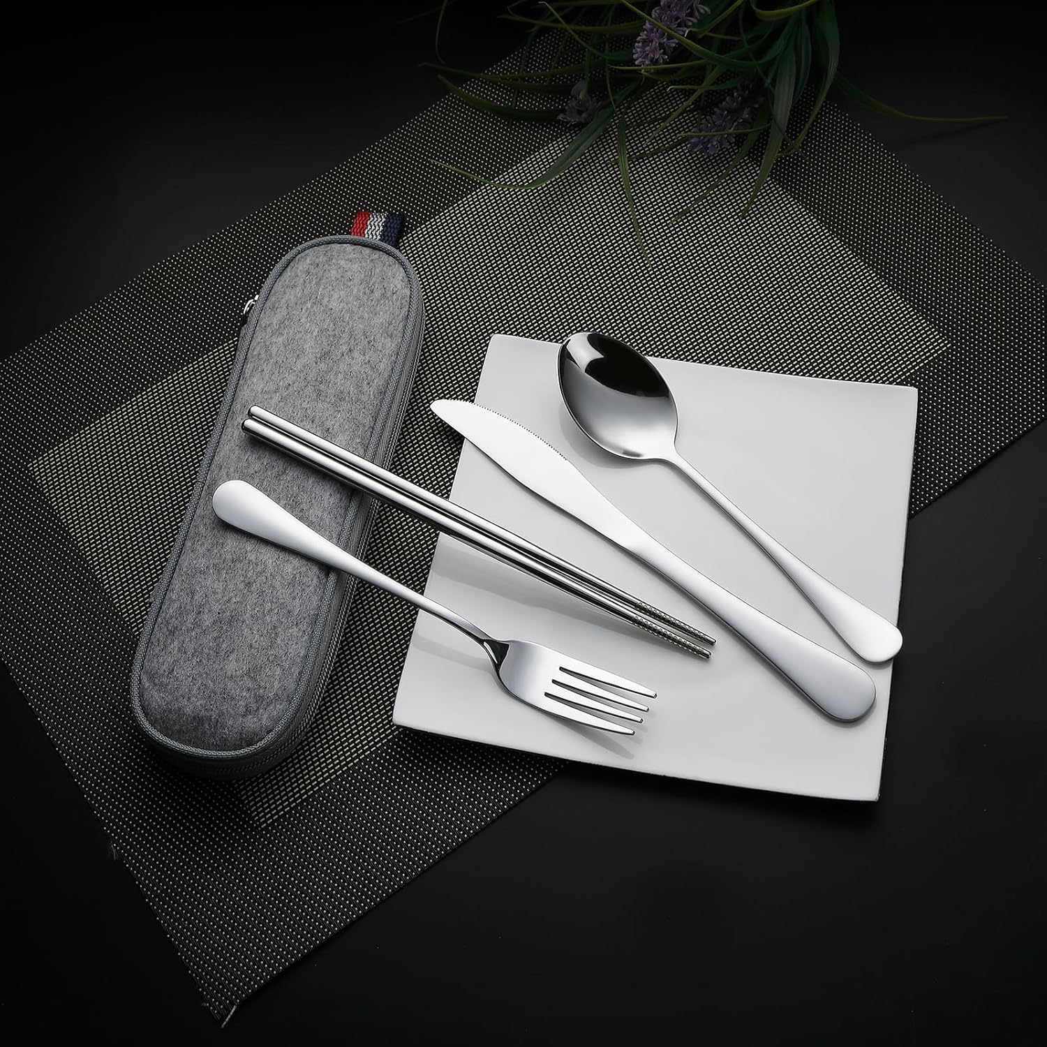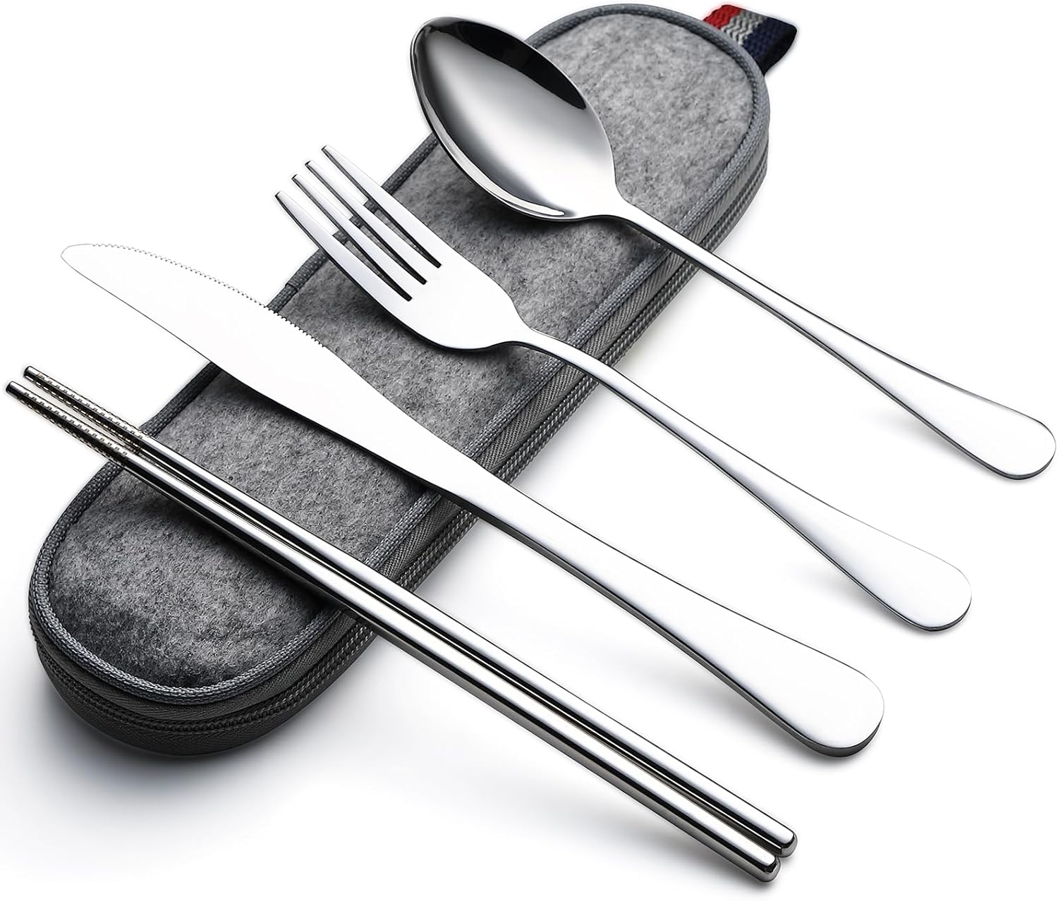 - 1.This minimalist 5pcs travel utensils set contains adult-sized fork, spoon, knife, chopsticks, and carrying case. The chopsticks are designed with reinforced laser etching, for better anti-slip and grab the food