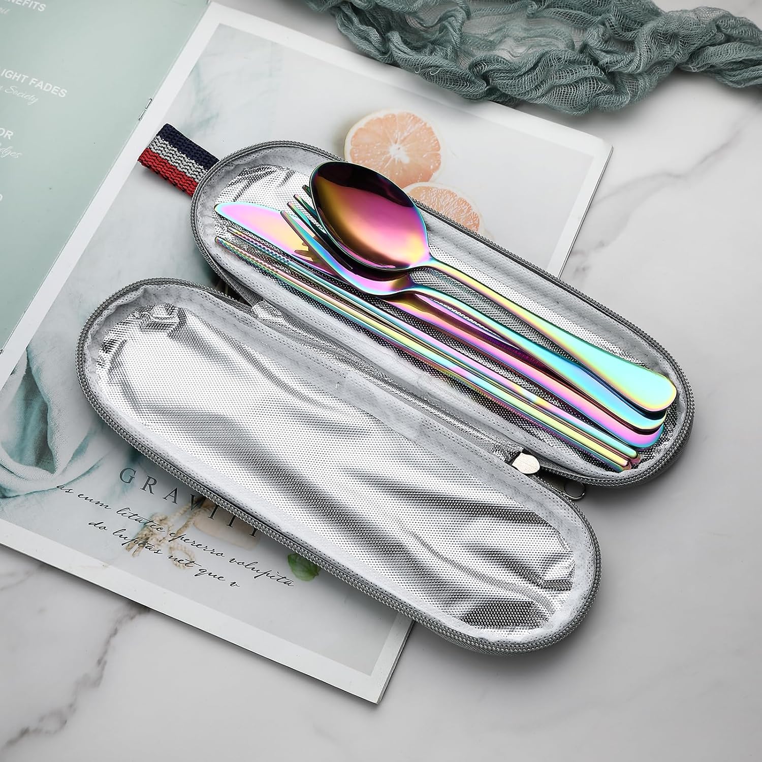 DEVICO Camping Utensils, Portable Travel Utensils with Case, Stainless Steel Reusable Silverware for Lunch Adult, 5Pcs Cutlery Set Includes Knife Spoon Fork Chopsticks and Case (Rainbow)