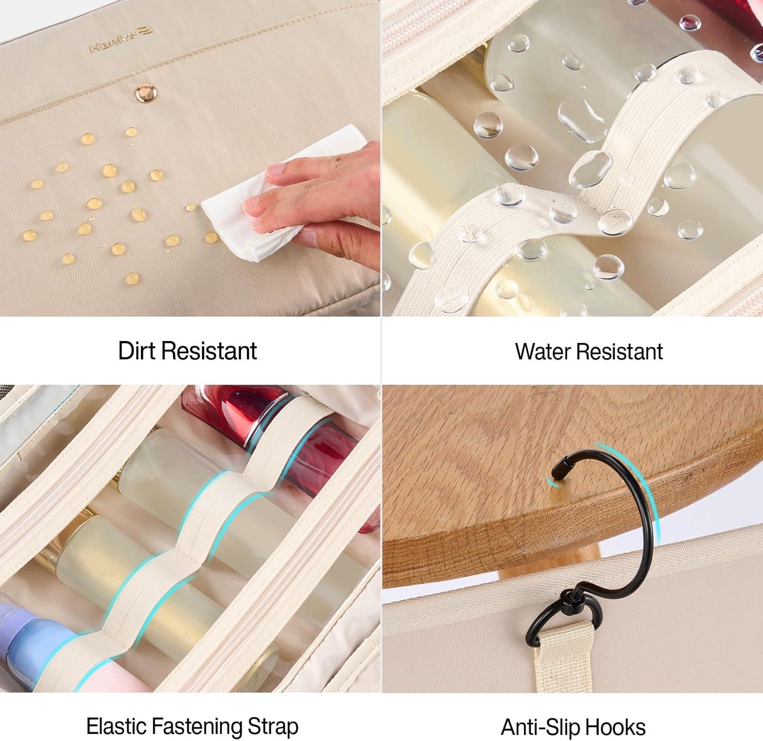 Hanke Hanging Travel Toiletry Bag for Women with Jewelry Organizer Compartment, Travel Essentials Toiletries and Makeup Bag, Water-Resistant & Stain-Resistant with Trolley Strap (Apricot)