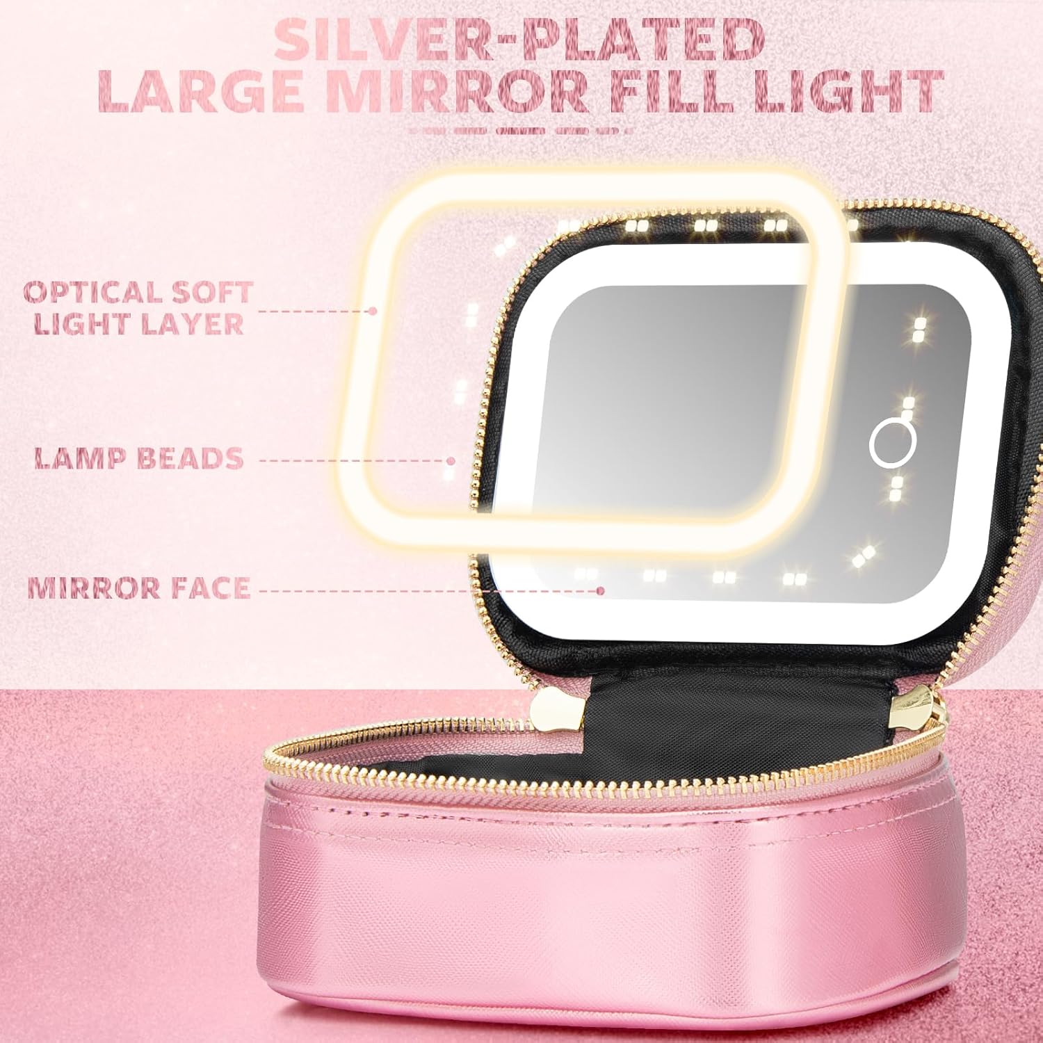 - 【Quality Material】The makeup mirror bag is made of waterproof PU leather, easy to clean, lined with durable polyester fiber Built-in 500 mAh battery, Type-c connector for quick charging, and the mirror is also removable.