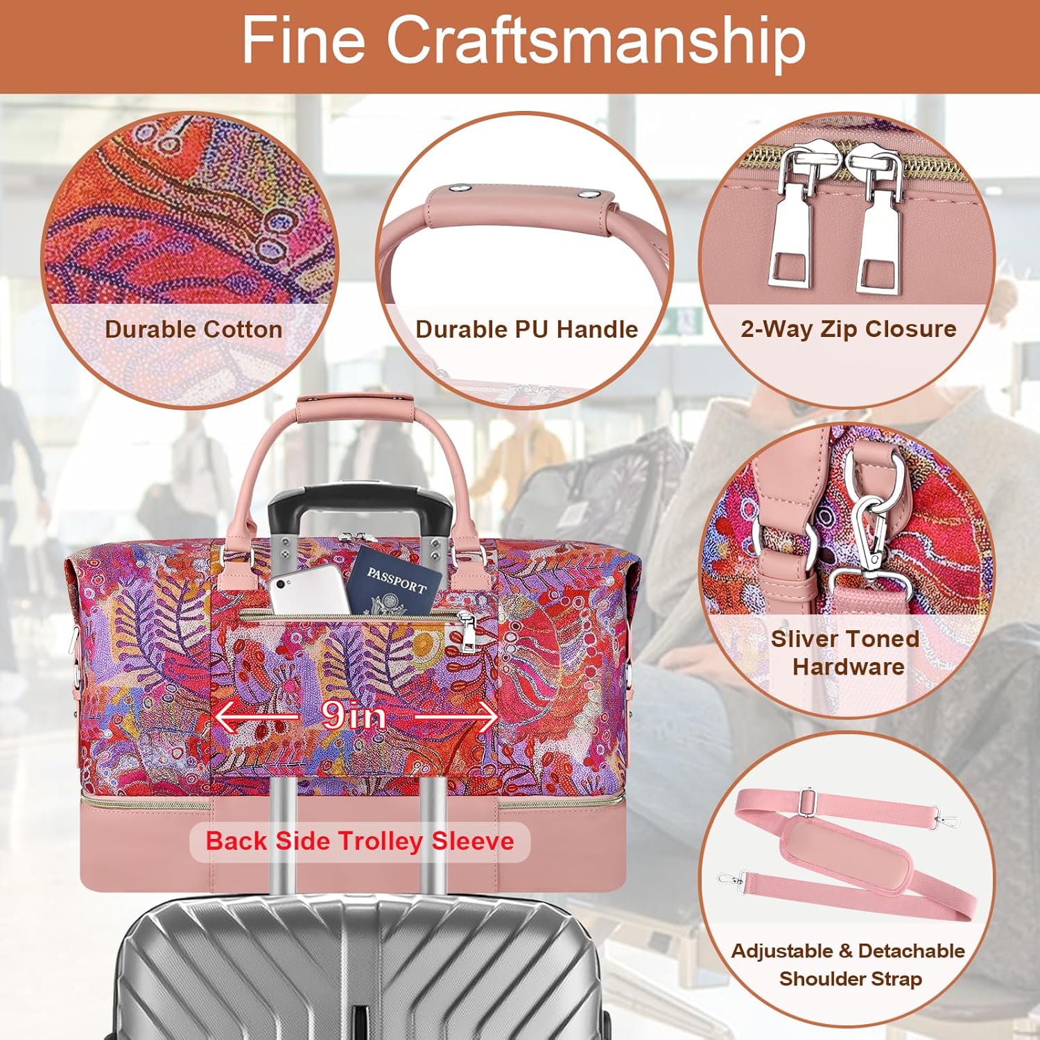 - Carry On Bag with Trolly Sleeve: Back side sleeve allows you to slide it over rolling suitcase luggage roller bag handles, and there also with a zip pocket to keep your passport and phone for easy access. Main compartment of this carry on duffel bag with 1 inner zip pocket and 2 slot pockets to hold your wallet, cosmetic or keys. Front zip pocket can fit your papers or books. Your ideal overnight weekend boarding bag for business or personal travel