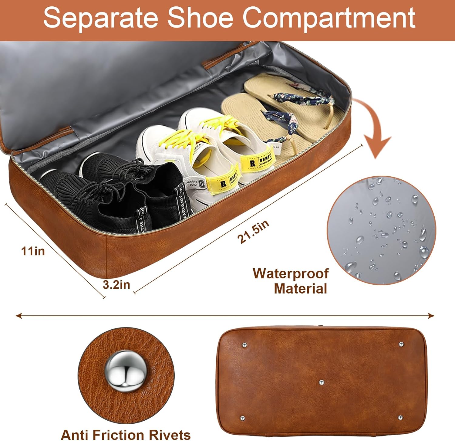 - Waterproof Separate Shoe Compartment: The shoes compartment of this travel duffle bag is fashioned with PVC waterproof materials to facilitate carrying your shoes during travel. This compartment can also be used to hold dirty clothes or wet towels, separating wet and dry to prevent your clean luggage from getting soiled or wet. Shoes compartment size: 21"Lx11"W*3.2"H and can fit up to 3 pairs of shoes. The thicker bottom can better carry weight