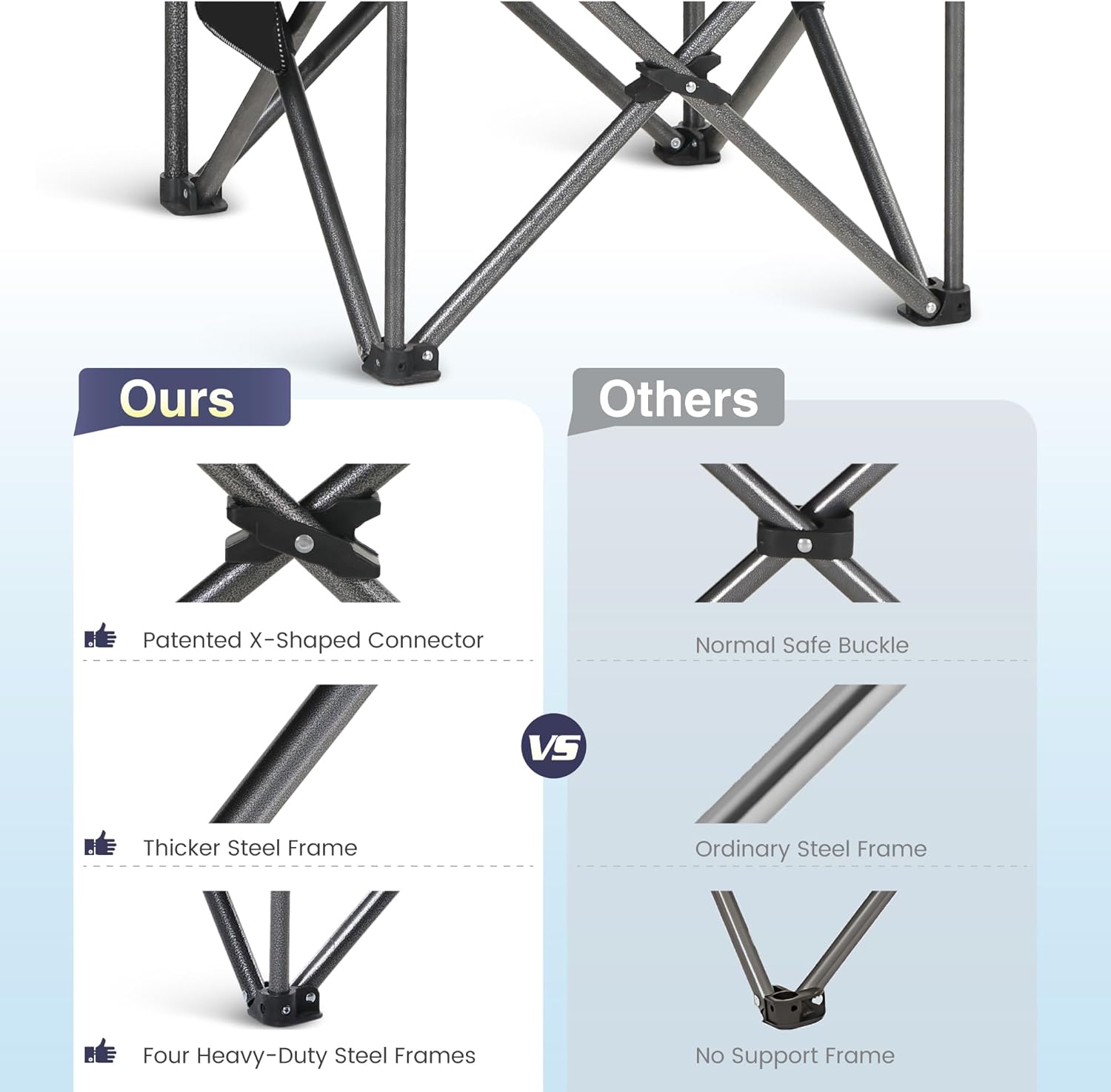 - Sturdy Material: This camping chair has hammer tone powder coating that can prevent corrosion and fading. Four heavy-duty steel frame was added to the bottom of the chair and enforce stability. Sturdy steel frame construction make it can support up to 450lbs/200kg.The 600D Oxford fabric is resistant to tears and abrasions, ensuring that this camping chair will last for years to come.