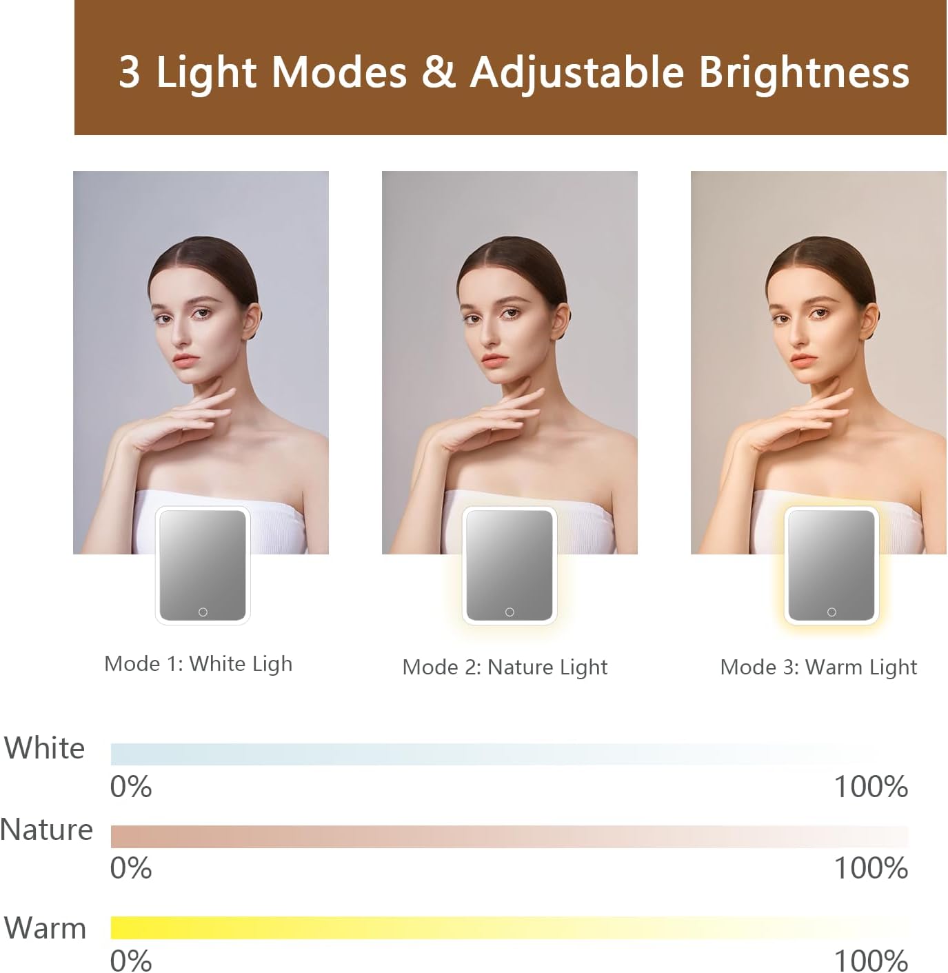 - 【makeup bag with led mirror】travel makeup bag is made of pu leather, waterproof and resistant, easy to clean.the travel makeup bag with of led light 3 color setting. 0-100% adjustable brightness that can be switched. with a long press on the switch, and a short press can adjust the color temperature between cool, natural and warm light.the make up bag can protect your cosmetics well, whether you are traveling or be away on official business, you can take your dresser everywhere.