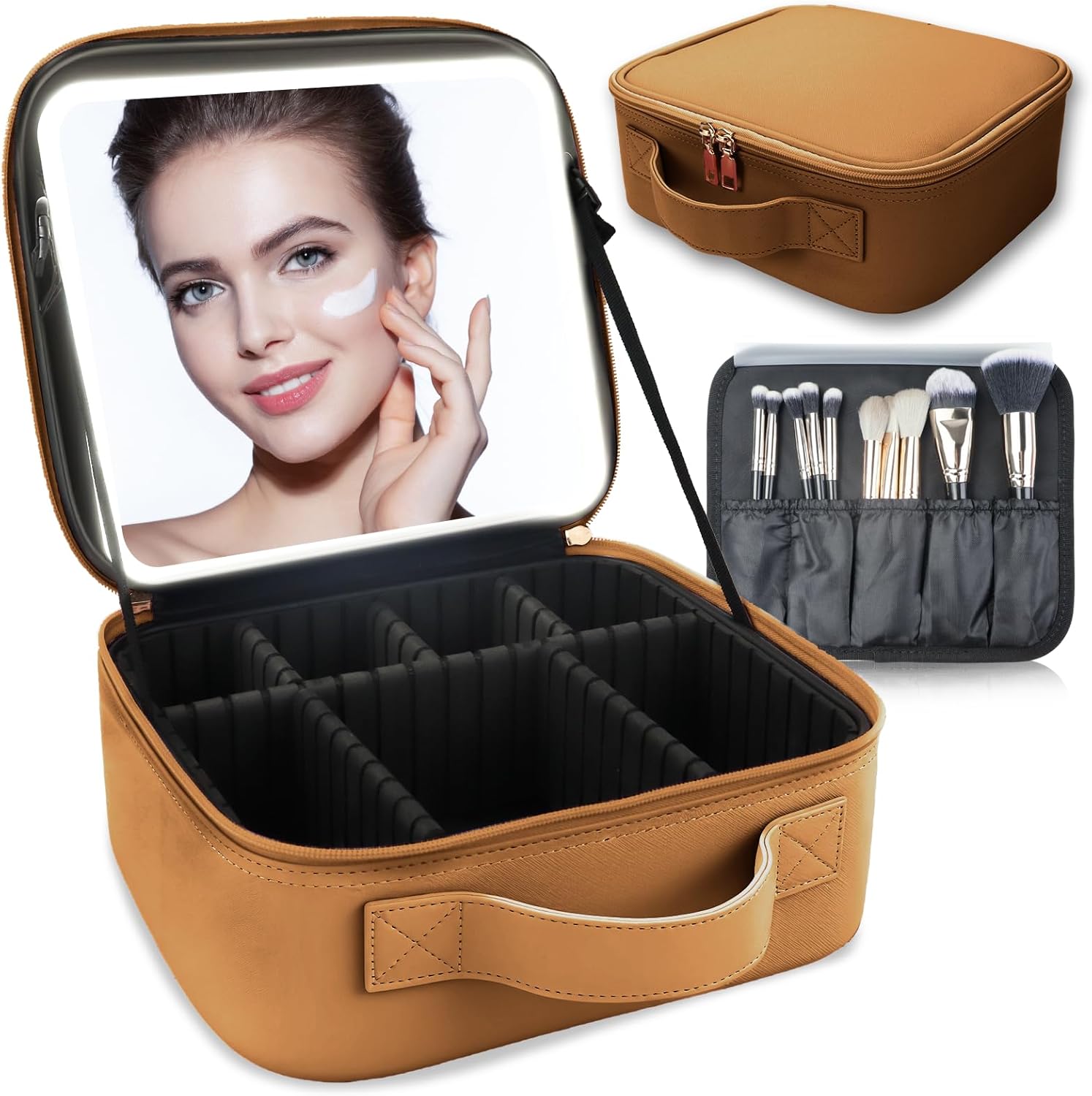 Makeup Bag with Led Mirror,Travel Makeup Organizer with 3 Color Setting, Portable Storage and Adjustable Dividers Travel Makeup Bag(brown)