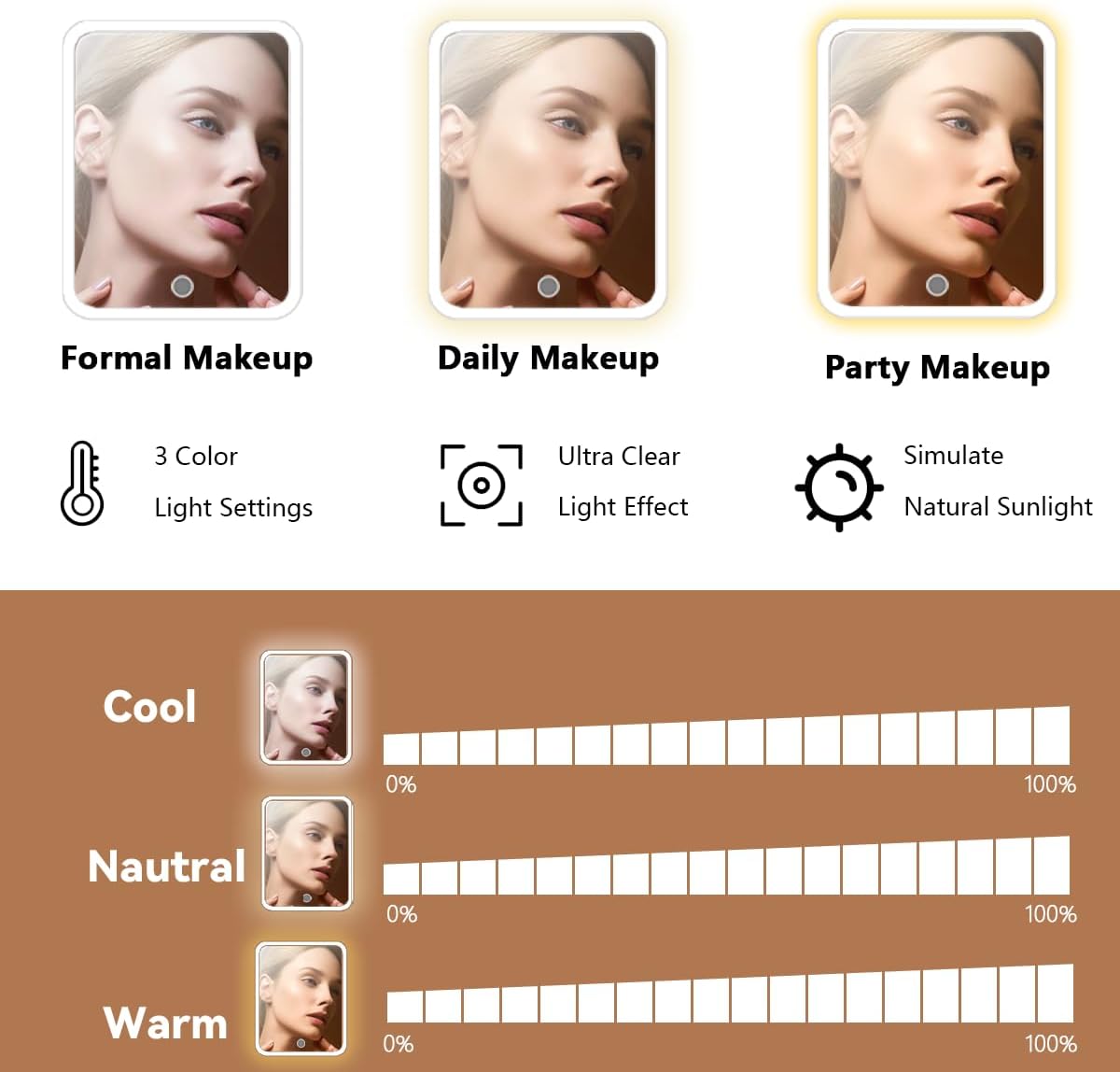 - 【Removable & Adjustable brightness High Definition LED mirror】:3 lighting modes and 0-100% adjustable brightness that can be switched. With a long press on the switch, and a short press can adjust the color temperature between cool, natural and warm light.The makeup mirror is firmly attached to the makeup bag by Velcro and can be disassembled for separate use, and the makeup mirror comes with a separate stand that can be conveniently placed on the table according to your needs.