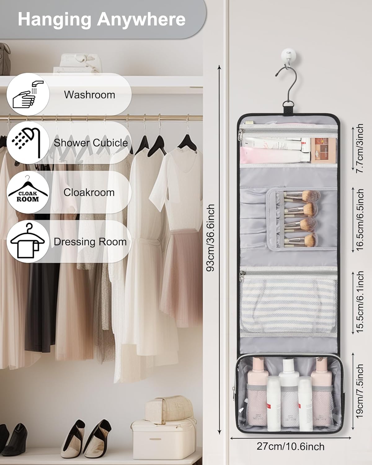- 【LARGE CAPACITY TOILETRY BAG】Foldable size with 10.6 x 8.5 x 2.4 inch, Open size with 10.6 x 32.5 inch (not include the hook). The space-efficient hanging toiletry container can hold all your travel essentials, such as cosmetics, travel-sized shampoo, Conditioner, and Skin care products