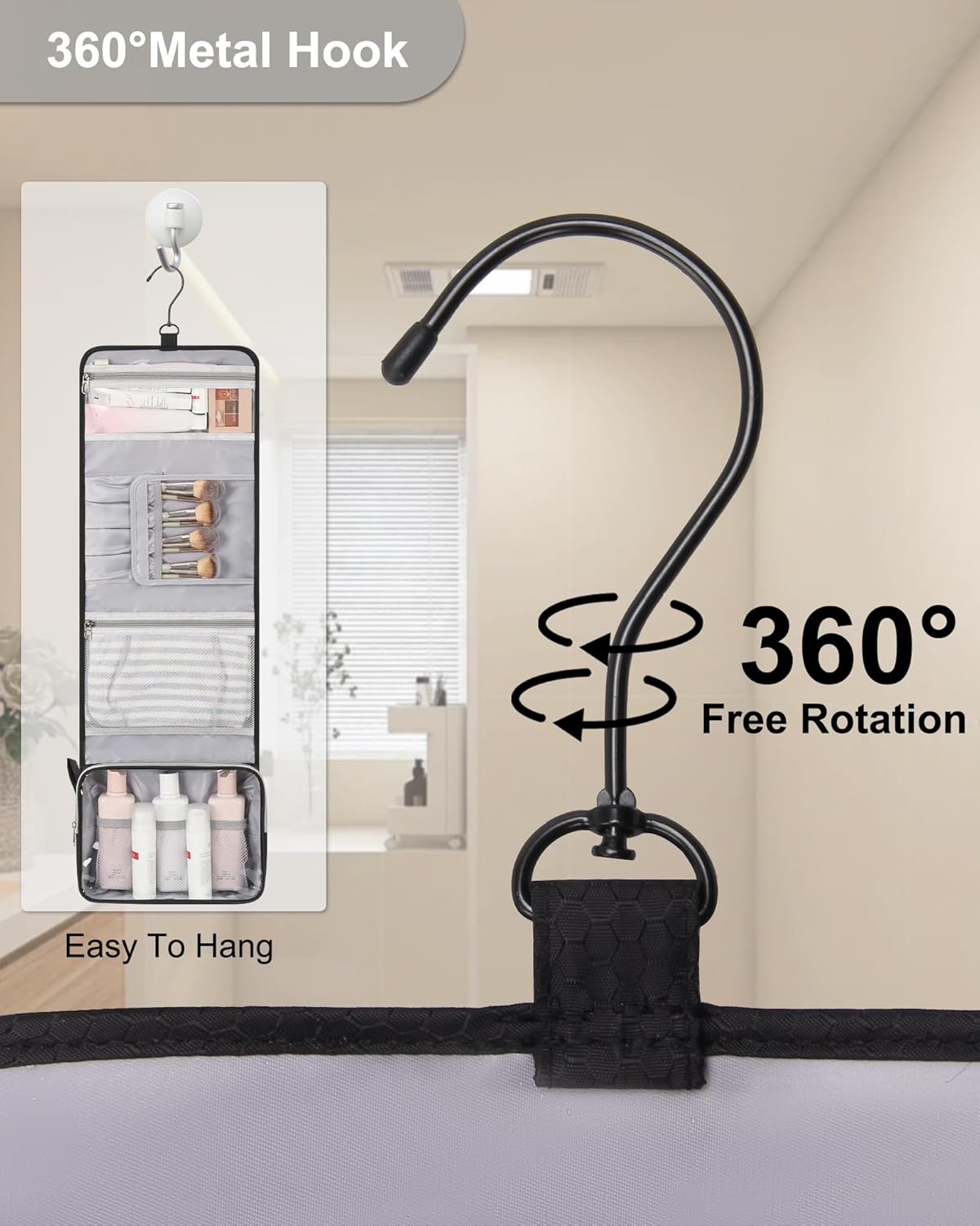 - 【360° ROTATION HANGING HOOK DESIGN】Stow-away 360 degree swivel non-slip metal hook for versatile hanging options. It fits bottles upright, helps eliminate spills, and makes a great travel organizer for your travel toiletries
