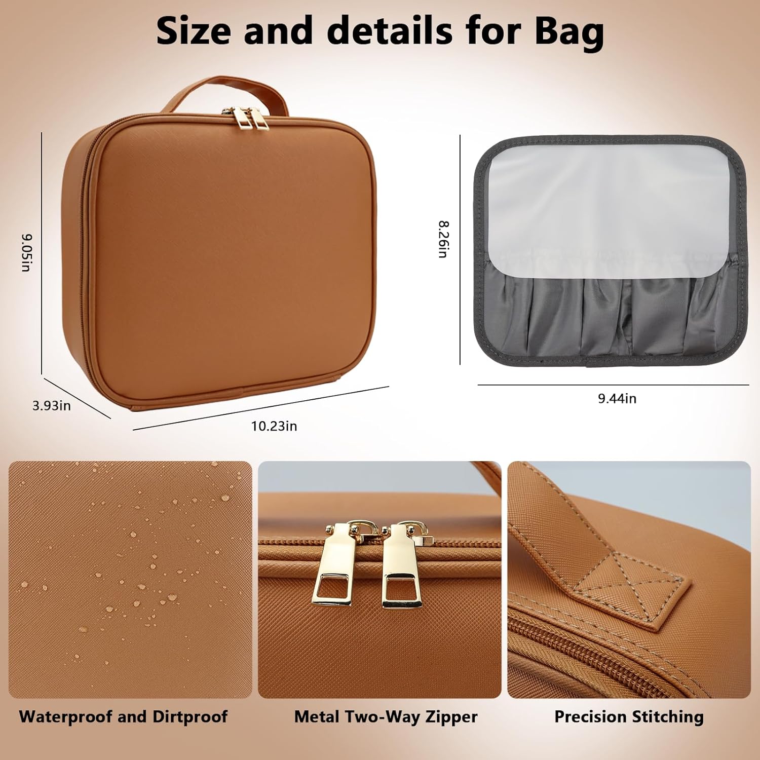 Travel Makeup Bag with LED Mirror Travel Makeup Organizer with 3 Lighted Settings, Adjustable Dividers and Makeup Brush Storage Bag Caramel