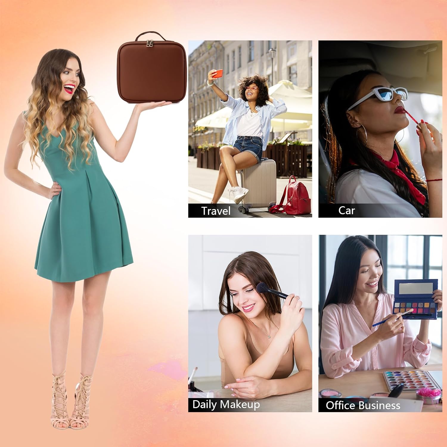 Travel Makeup Bag with LED Mirror Travel Makeup Organizer with 3 Lighted Settings, Adjustable Dividers and Makeup Brush Storage Bag Dark Brown