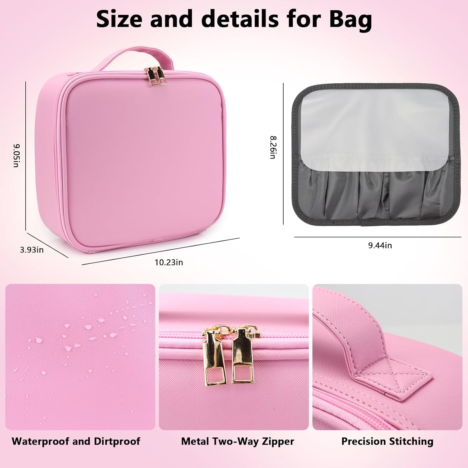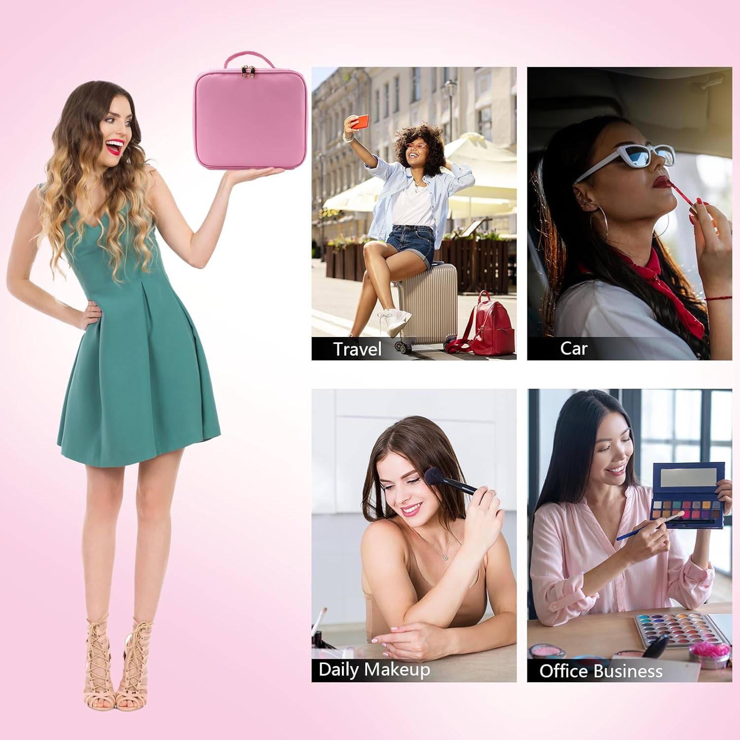 Travel Makeup Bag with LED Mirror Travel Makeup Organizer with 3 Lighted Settings, Adjustable Dividers and Makeup Brush Storage Bag Dark Pink