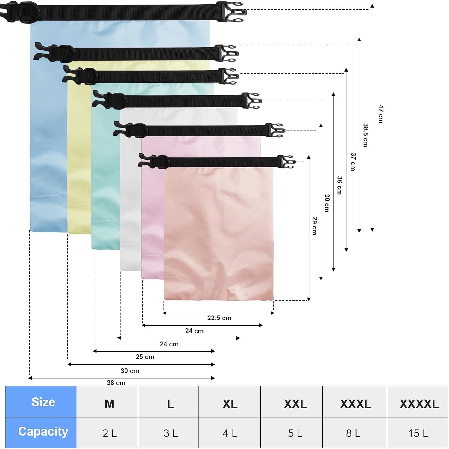 - Ample amount: the package includes 12 pieces of waterproof dry bags, including the capacity of 15 L, 8 L, 5 L, 4 L, 3 L and 2 L, 2 pieces of long adjustable shoulder straps (15 L and 8 L may need to use), different sizes and colors are prepared to satisfy your various needs
