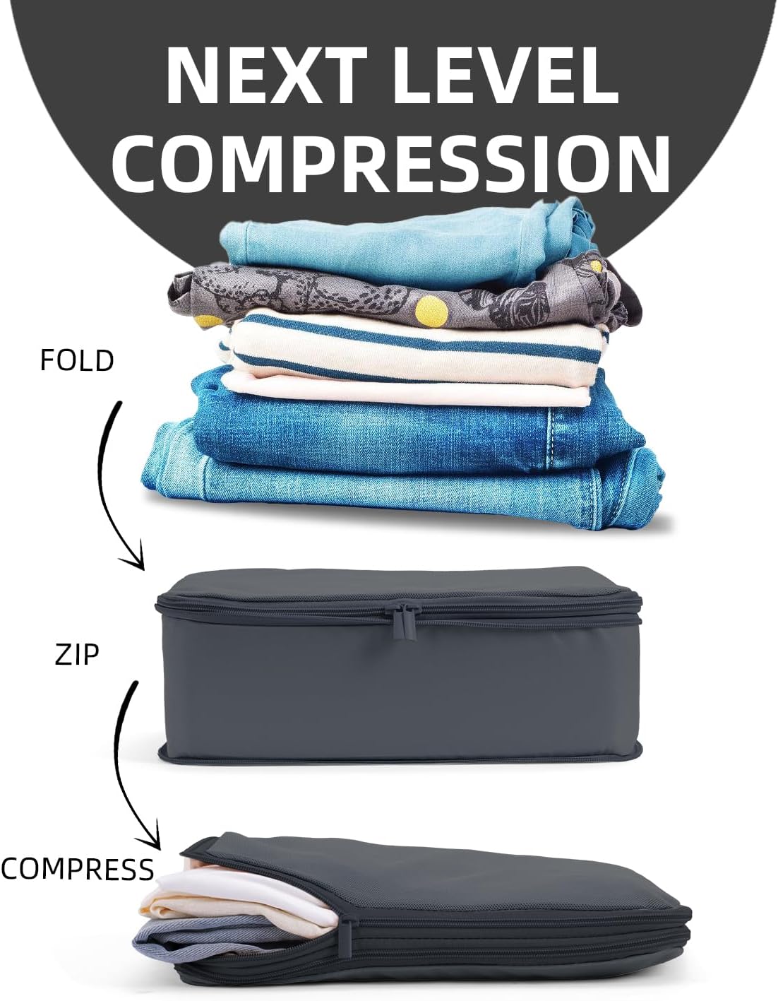 - Maximize Luggage Space: Our compression packing cubes use innovative technology to shrink your clothes, saving up to 50% more space in your suitcase, backpack, or carry-on. Perfect for fitting all your travel essentials without the bulk.