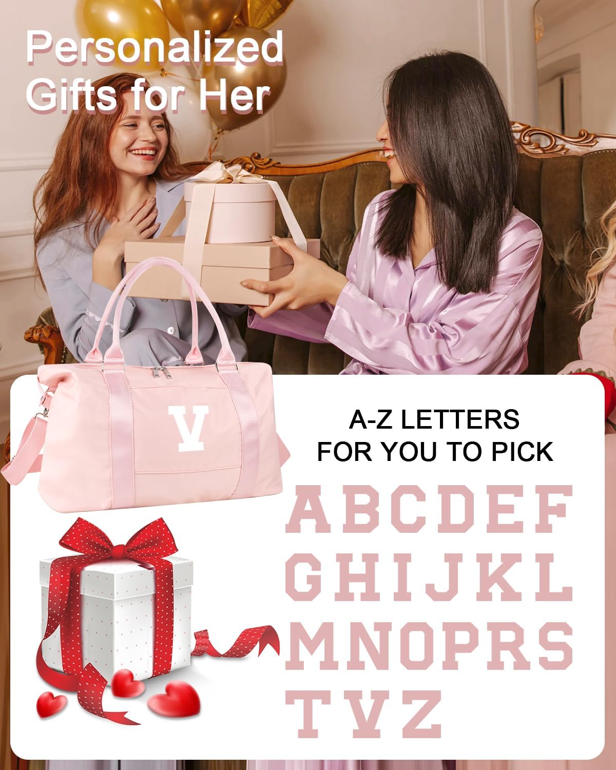 Initial Travel Duffel Bag Sports Gym Bag for Girls Teen Birthday Gifts,Pink Personalized Weekender Bag Carry On Tote Bags for Women Men,Waterproof Overnight Luggage Bag with Trolley Sleeve(Letter V)