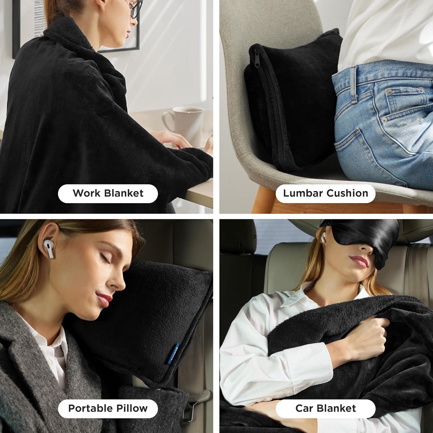 Bedsure Travel Blanket Airplane Compact with Storage Bag, Packable Blanket with Eye Mask, Lightweight 2-in-1 Travel Essentials, Functioned as Pillow for Airplane Comfort and Warmth, Black