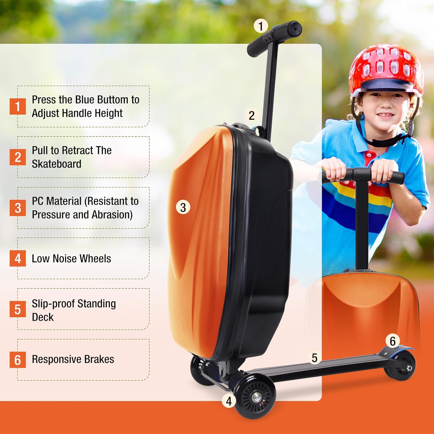20" Scooter Suitcase for Kids, 2-in-1 Ride On Luggage with Wheels for Boys & Girls Ages 4-15, Foldable Hardshell Carry On Lightweight Travel Suitcase for Airplane (No LED, Orange)
