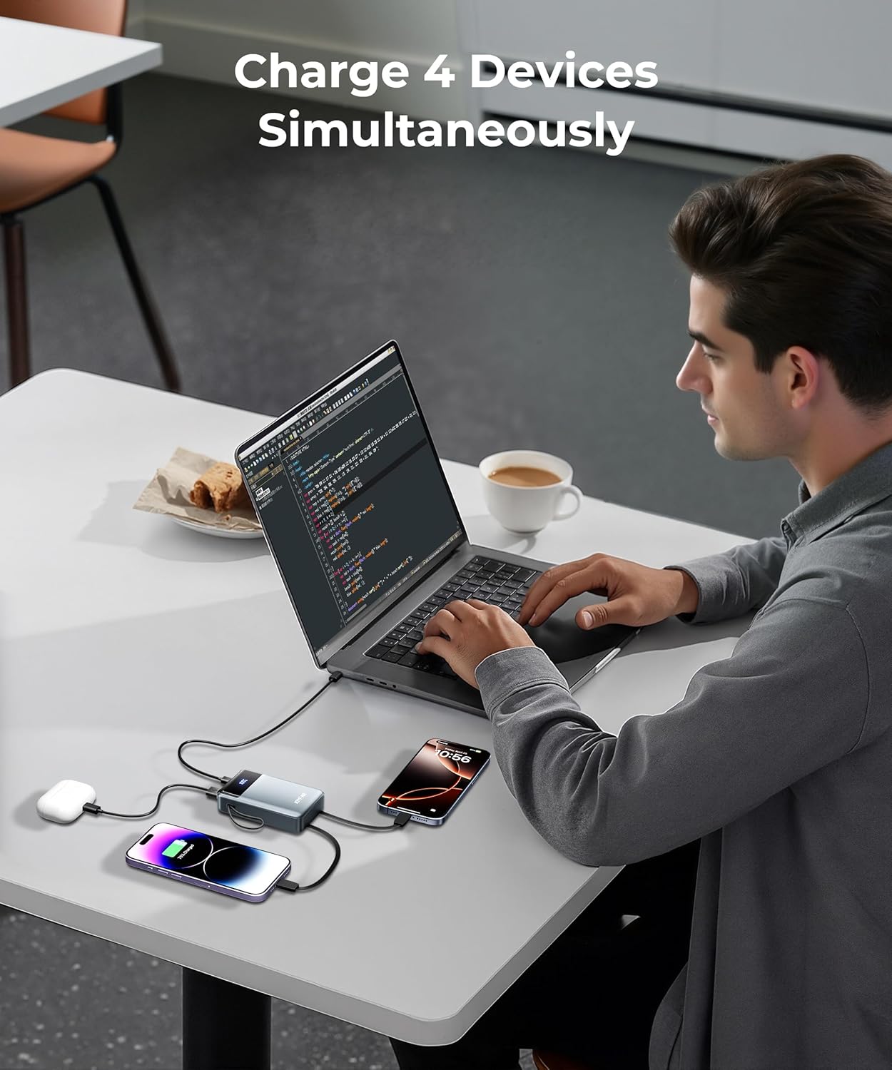 Portable Charger Power Bank - 30000mAh 65W Laptop Travel Essentials Battery Pack USB C Built in Cable Phone Fast Charging Compatible with iPhone 16 15 14 13 iPad MacBook Samsung Google (Grey)