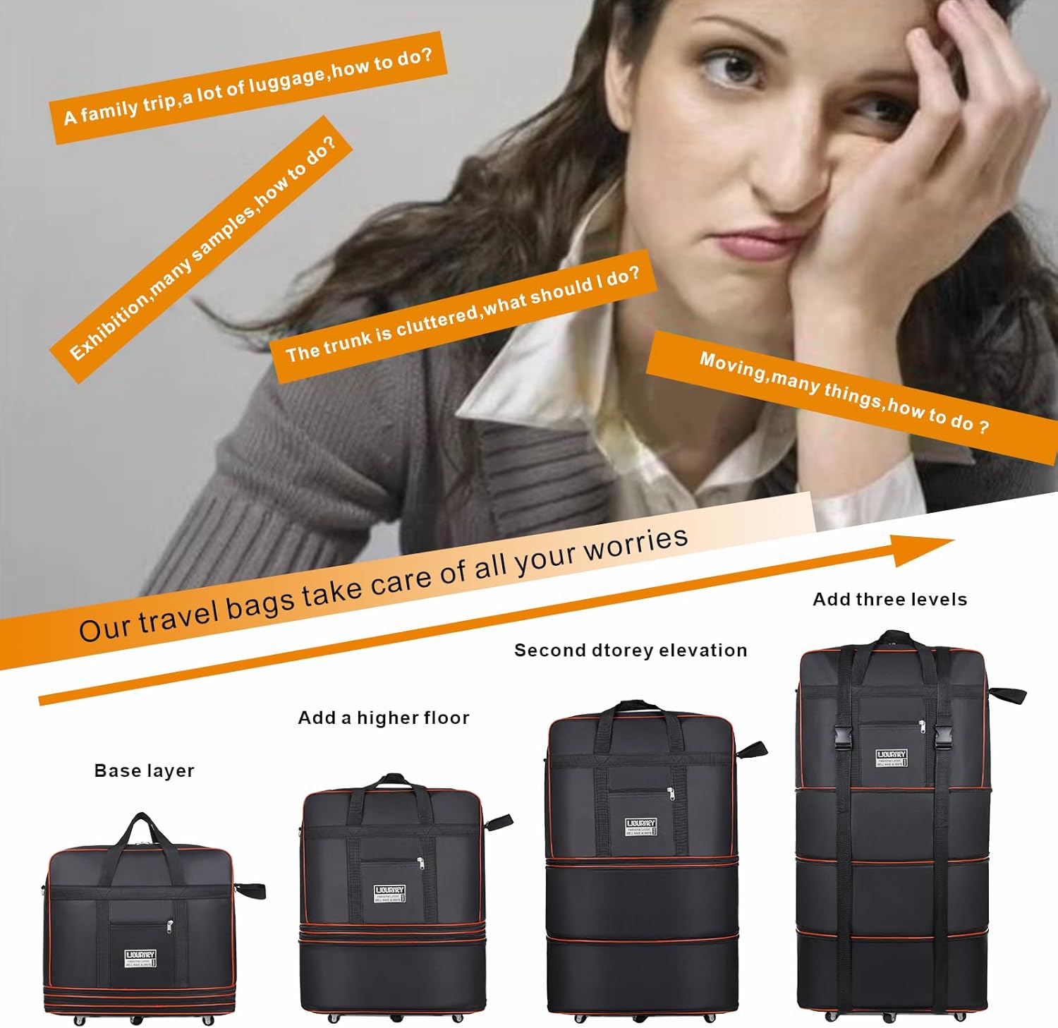 - STRUCTURE: Foldable and expandable design, space saving and easy to organize. Foldable duffel bag with wheels has 6 universal wheels at the bottom, you can rotate 360 degrees at will, silent travel, foldable duffel bag is designed with a drawstring on the side, which can be pushed and pulled horizontally, and the drawstring can also be put on the back as a strap and used like a backpack. Save time and labor. Ideal large travel bag for family travel, consignment, immigration, moving and more.
