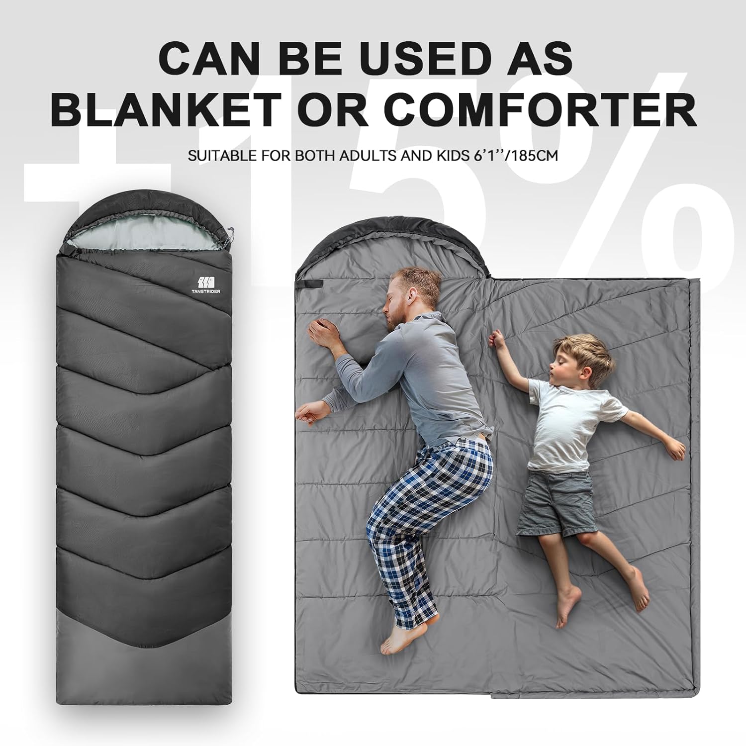 - 【GREAT SLEEPING BAGS FOR ADULTS AND KIDS】Comfortably fits most campers up to 6 FEET, 1 INCH tall. SIZE: 31.5 by 86.6 inches (W x D). Opens up to make a nice Comforter