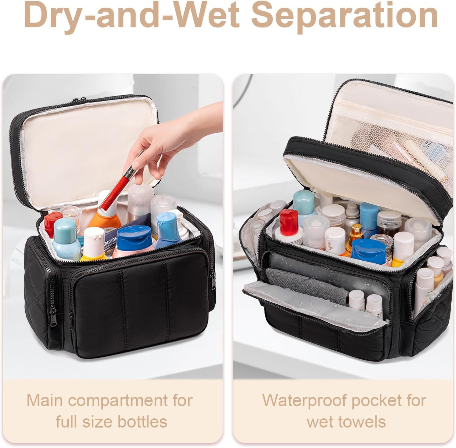 LEDAOU Toiletry Bag for Women,Quilted Travel Makeup Bag Organizer with Double Deck, Large Wide-open Cosmetic Make up Bag for Travel Essentials (Black Puffy)