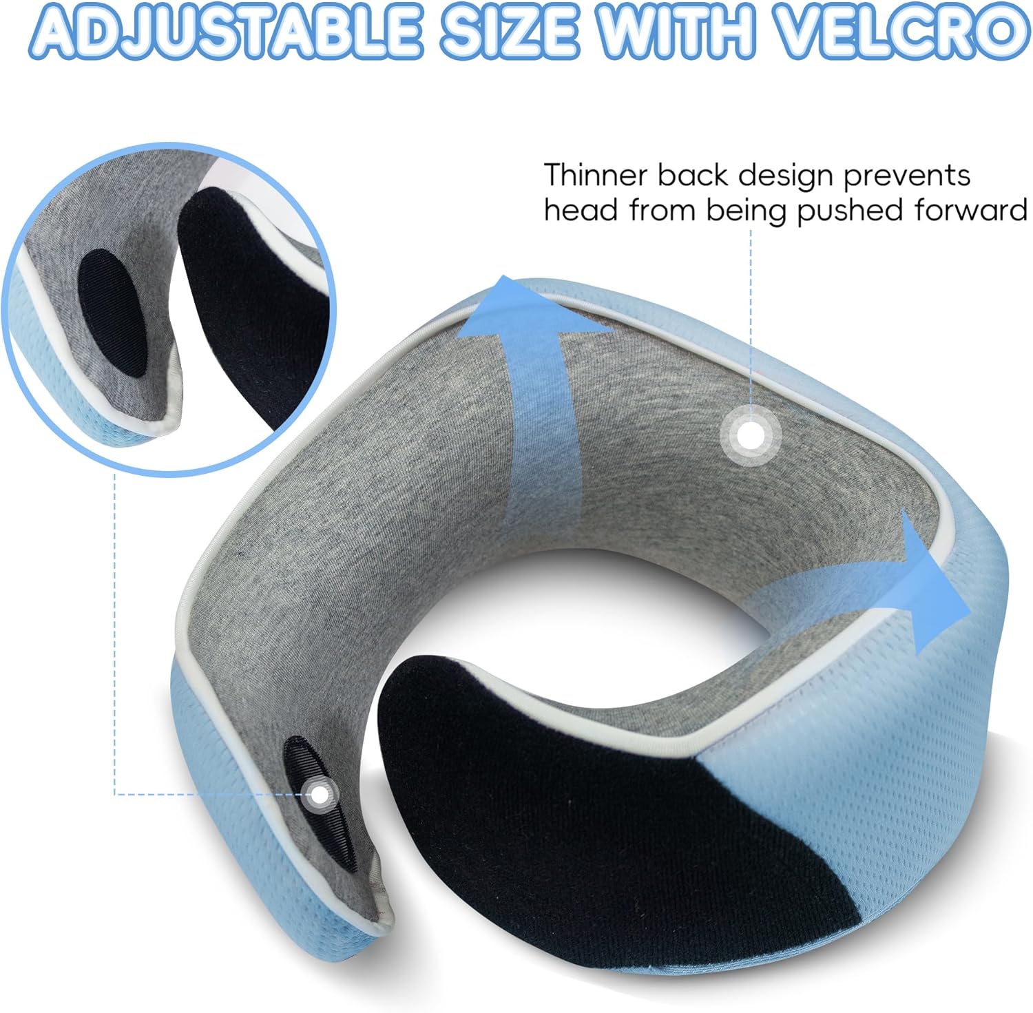 Junior Kids Travel Neck Pillow - Ergonomic Memory Foam Pillow for Airplane, Car, Booster Seat - Soft, Washable, Compact Travel Pillow with Strap - Light Blue - Ages 4–13
