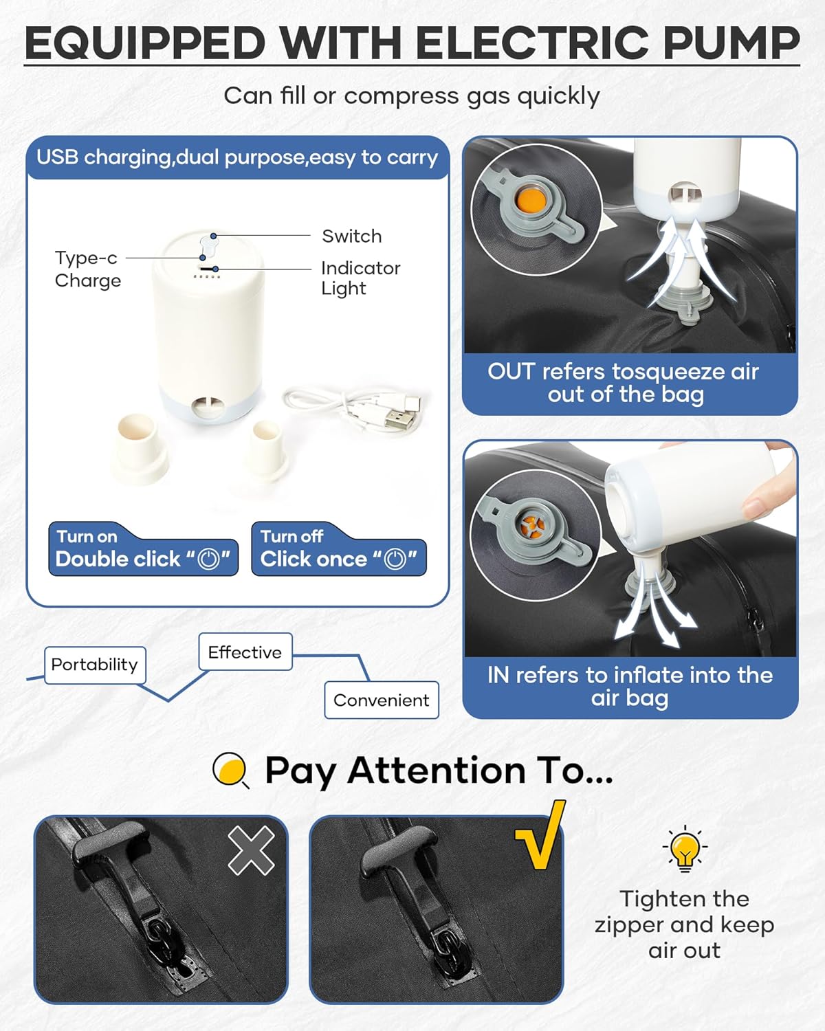 - Compressing Space: This vacuum travel backpack is equipped with an electric pump to quickly extract air. First, zipper up the zipper after putting the clothes into the pocket; second, double-click the power button of the electric pump and align it with the air holes; third, close the air hole cover after achieving the compression effect. The vacuum compression can greatly reduce the size of clothing, the backpack can hold more items, convenient for travelers to carry more essentials.