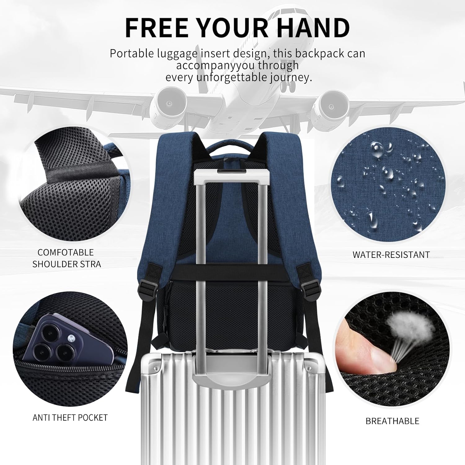 - 【LARGE CAPACITY & WATERPROOF】The mens backpack is made of high density waterproof polyester. There is an independent laptop protection compartment, which can fit a 15.6 Inch laptop. The front of the blue backpack also includes 4 pockets of different sizes, which can store passports, power banks, pencil cases, clothes and other items needed for daily school, study, office and travel.