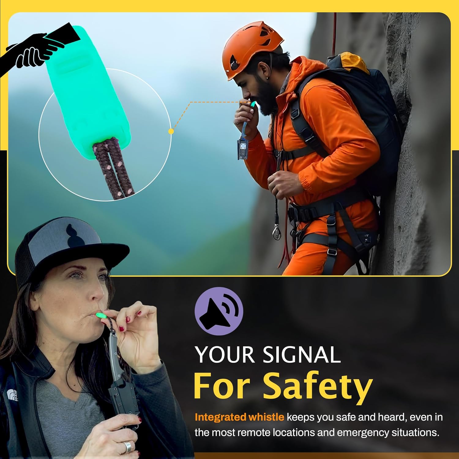 - Glow-in-the-Dark Handle and Emergency Whistle: The fluorescent, glow-in-the-dark handle enhances visibility in low-light conditions, helping you keep track of your knife. Equipped with a powerful 115dB emergency whistle, this knife provides a reliable signaling tool for survival scenarios, making it a must-have for safety in the wilderness.