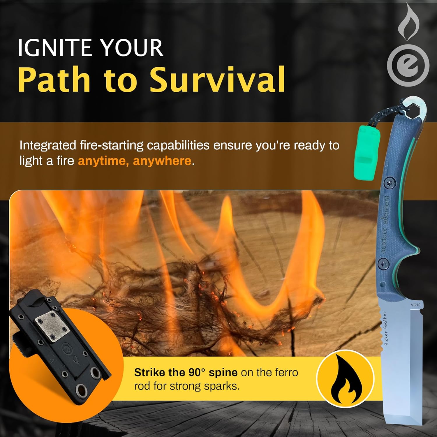 - Built-In Firestarter for Survival Preparedness: Light fires effortlessly with the replaceable ferro rod integrated into the sheath. Simply strike the 90-degree spine of the blade against the ferro rod to create a shower of sparks, even in challenging weather. A dependable fire starter tool for camping, bushcraft, and emergencies.