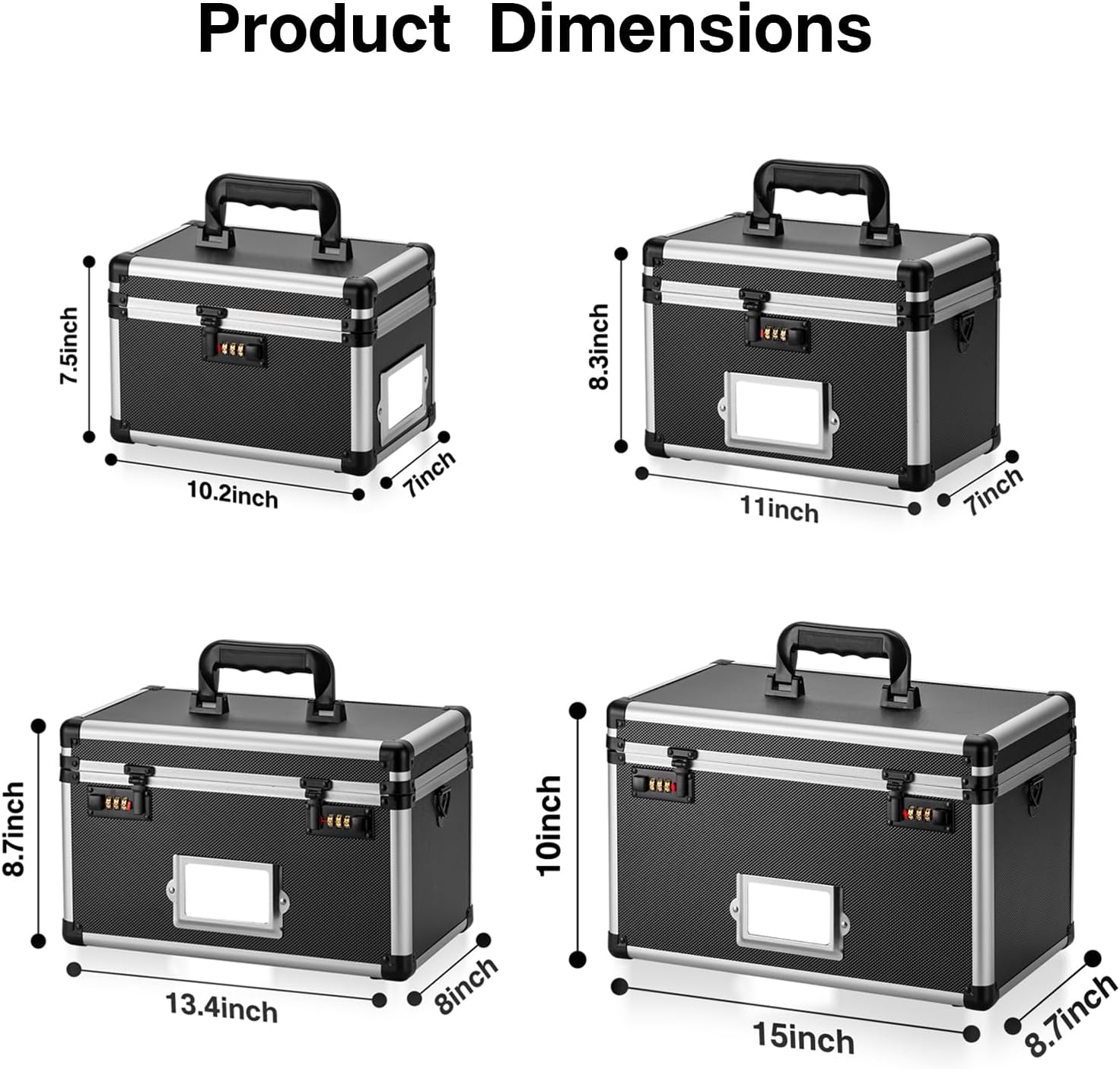 - 【Multiple Size Options】Our secure lock boxes come in 4 versatile sizes: 10.2"L x 7"W x 7.5"H (perfect for cash and small valuables), 11"L x 7"W x 8.3"H (ideal for medicine and personal items), 13.4"L x 8"W x 8.7"H (great for books, and bulkier electronics), and 15"L x 8.7"W x 10"H (fits standard office files and 14" laptops). Choose the perfect size to protect what matters most to you