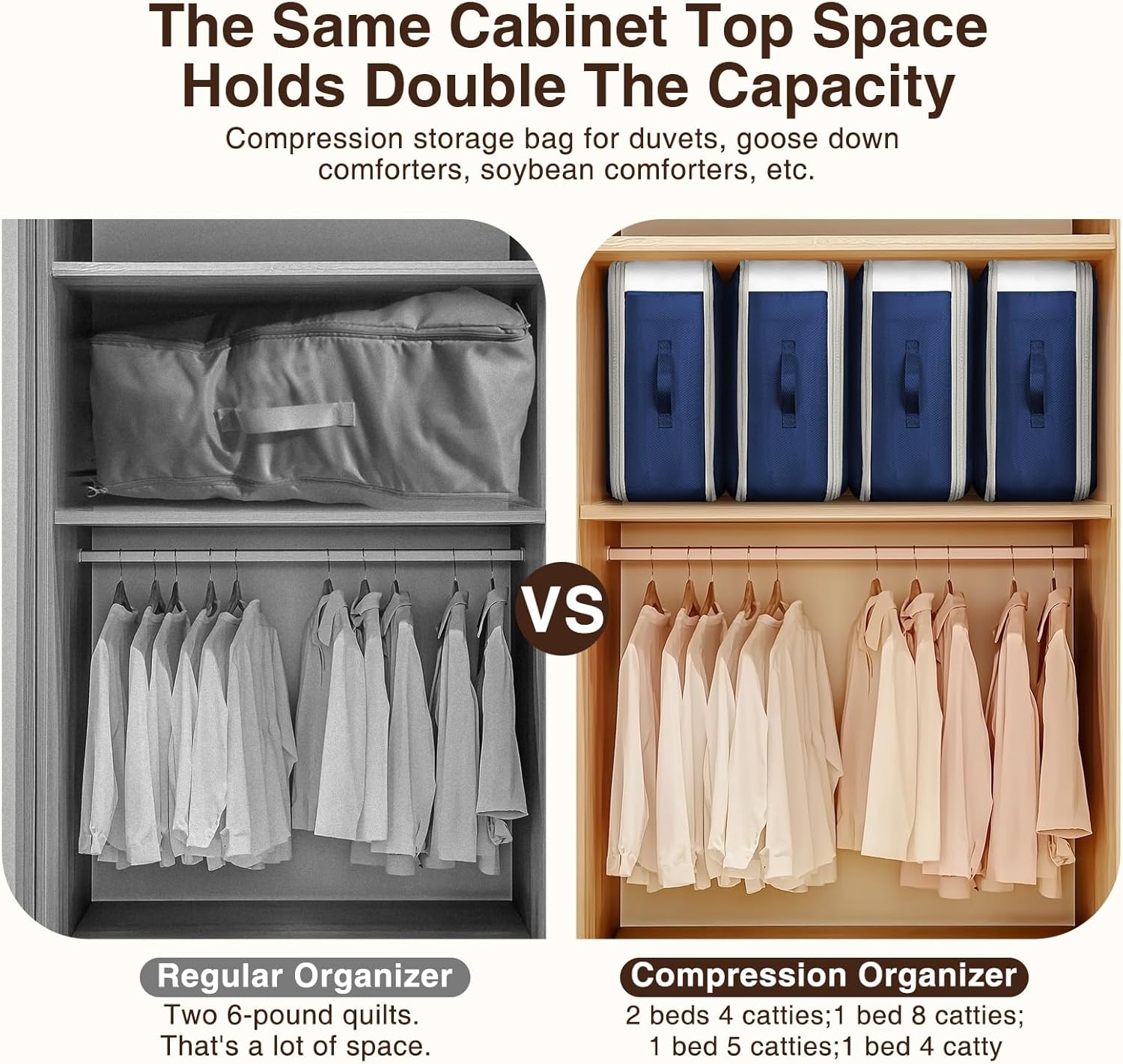 - [Large-Capacity Versatile Storage]: These compression clothing storage bags are ideal for storing comforters, blankets, winter coats, down jackets, sweaters, pillows, bed sheets, towels, scarves, and even seasonal clothing, adapting to all your storage needs. From bulky duvets to lightweight quilts, they accommodate a wide range of items. The ultra space saving self compression design maximizes closet or under-bed space, keeping everything compact, organized, and protected