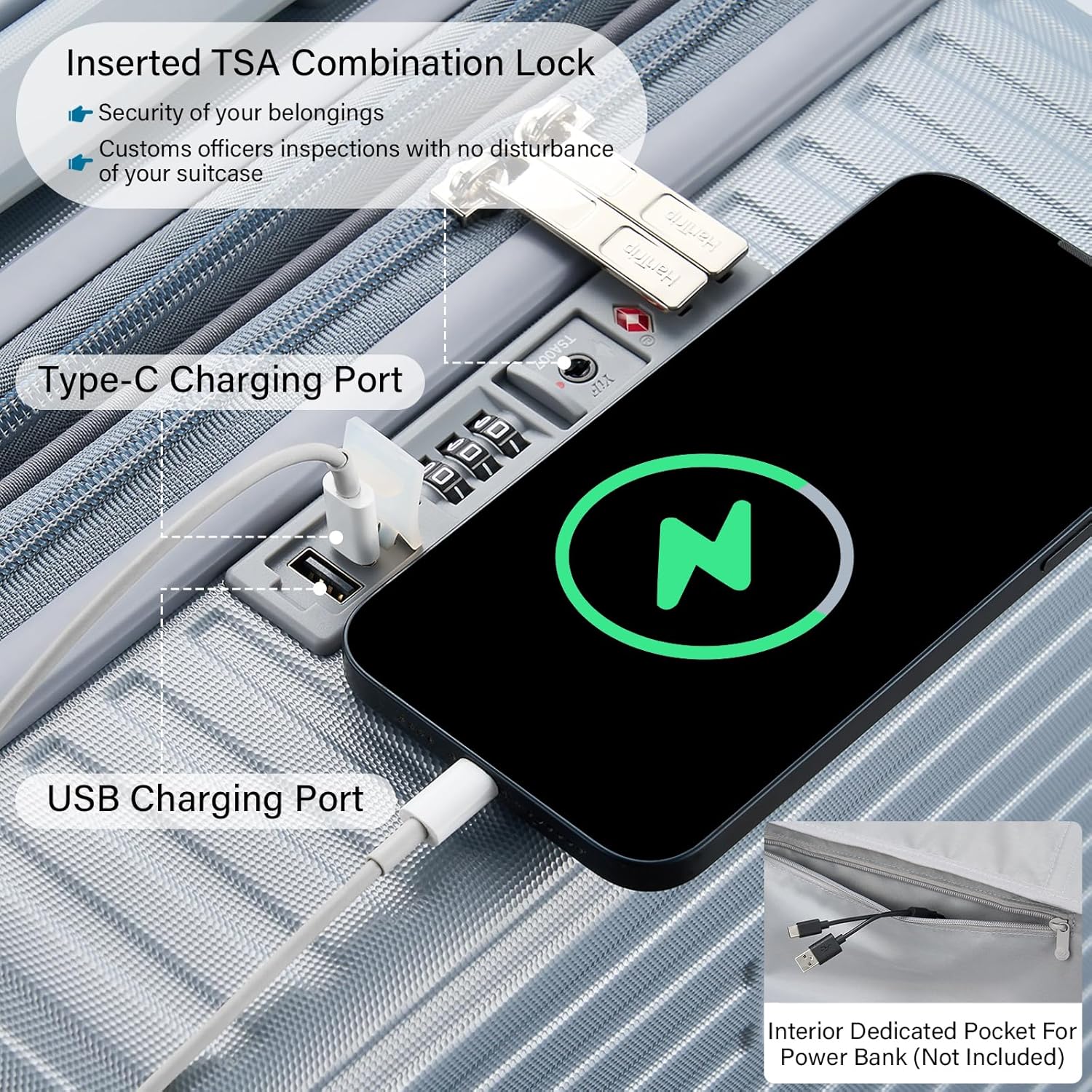 - 【Cup / Phone Holders & 2 Charging Ports】22x14x9 carry on luggage is engineered with a universal cup holder for most water bottles, coffee mugs and tumblers. Retractable dual hooks securely hold various persoanl items like phone, iPad, U-shape throw pillow, handbag, etc (up to 11 lbs). Built-in charging ports allow on-the-go power access for Type-C / USB devices (portable power bank not included). Multifuncational silver luggage to set your hands free during layover at airport / train station.
