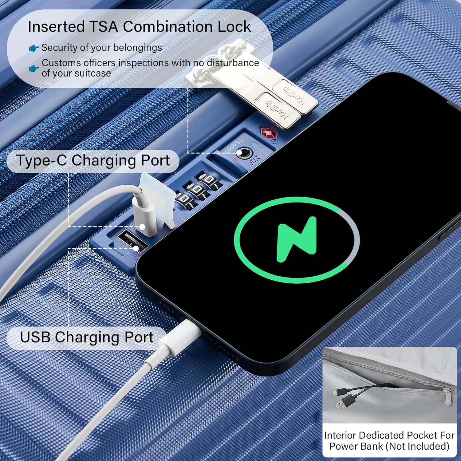 - 【Cup / Phone Holders & 2 Charging Ports】3 piece luggage set is engineered with a universal cup holder for most water bottles, coffee mugs and tumblers. Retractable dual hooks securely hold various persoanl items like phone, iPad, U-shape throw pillow, handbag, etc (up to 11 lbs). Built-in charging ports allow on-the-go power access for Type-C / USB devices (portable power bank not included). Multifuncational blue luggage set to set your hands free during layover at airport / train station.