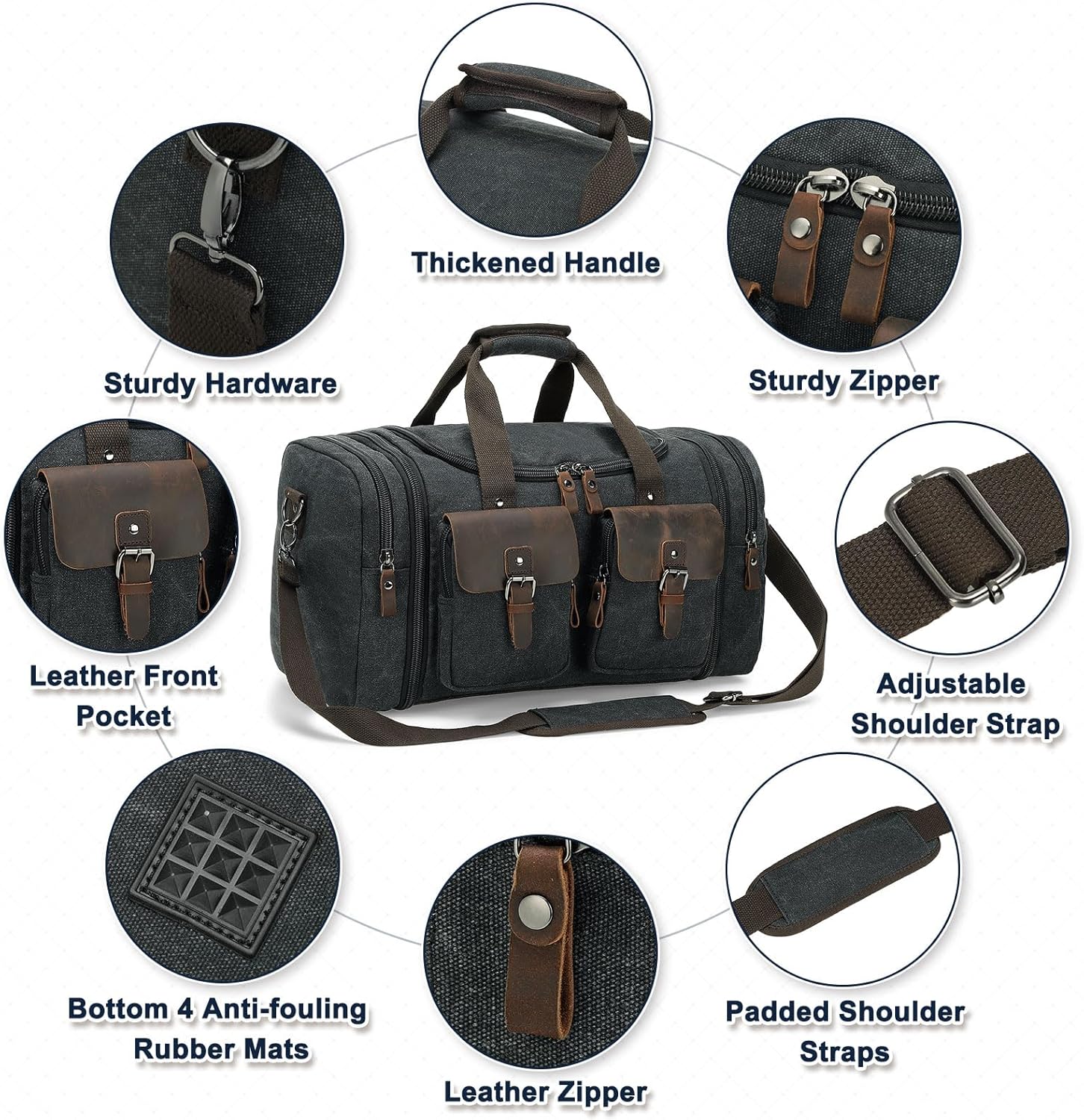 Canvas Duffle Bag with Genuine Leather Accents, Expandable 20-23 Inch Travel Weekender, Multiple Pockets, Black