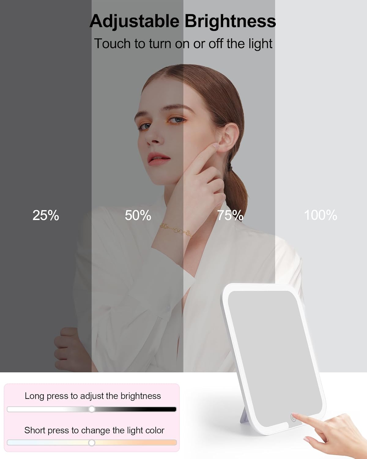 - USB Rechargeable Makeup Mirror: New generation makeup case design with LED makeup mirror, with cold white / natural / warm three-tone settings, and the brightness can be adjusted 0%-100%, which can perfectly meet your different makeup needs and make your makeup more delicate.