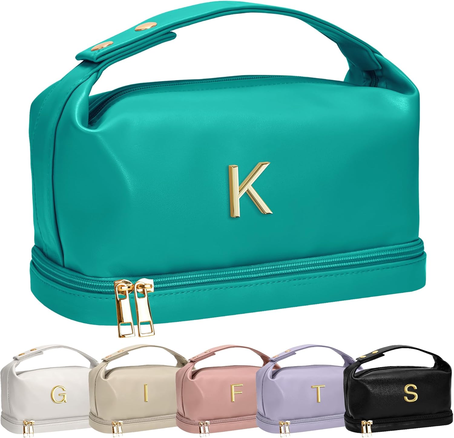 - 【Double-layer Design】The monogrammed makeup bags is double-layer with a unique design of upper and lower storage areas. The bottom compartment is great for storing cosmetics, eye shadows, makeup brushes, and other items. The top layer features a large opening for easy access, along with two small compartments for lipsticks and earrings.