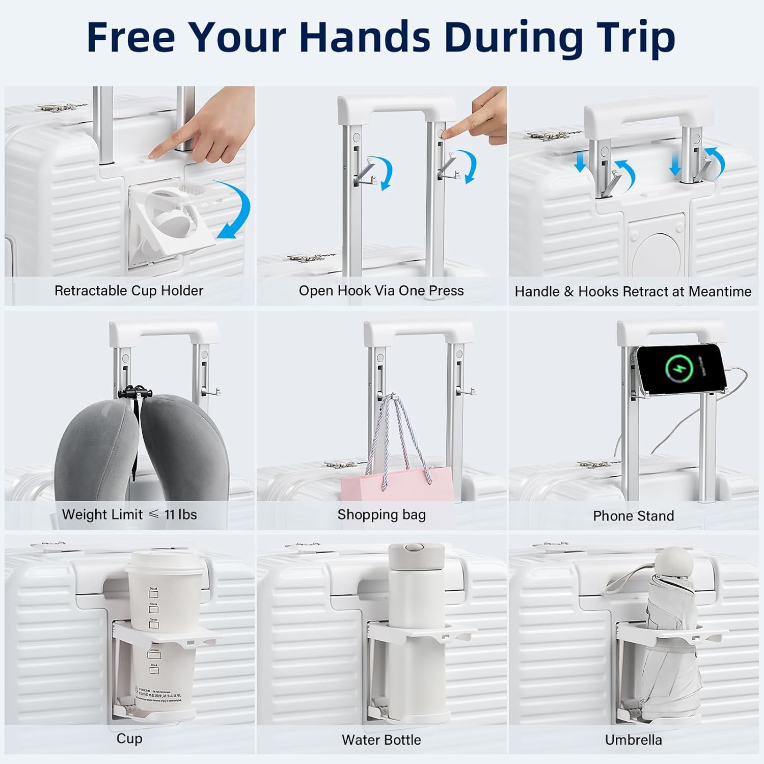 - 【Cup / Phone Holders & 2 Charging Ports】24 inch suitcase with spinner wheels fearures a universal cup holder for most water bottles, coffee mugs and tumblers. Retractable dual hooks securely hold various persoanl items like phone, iPad, U-shape throw pillow, handbag, etc (up to 11 lbs). Built-in charging ports allow on-the-go power access for Type-C / USB devices (portable power bank not included). Multifuncational white luggage to set your hands free during layover at airport / train station.