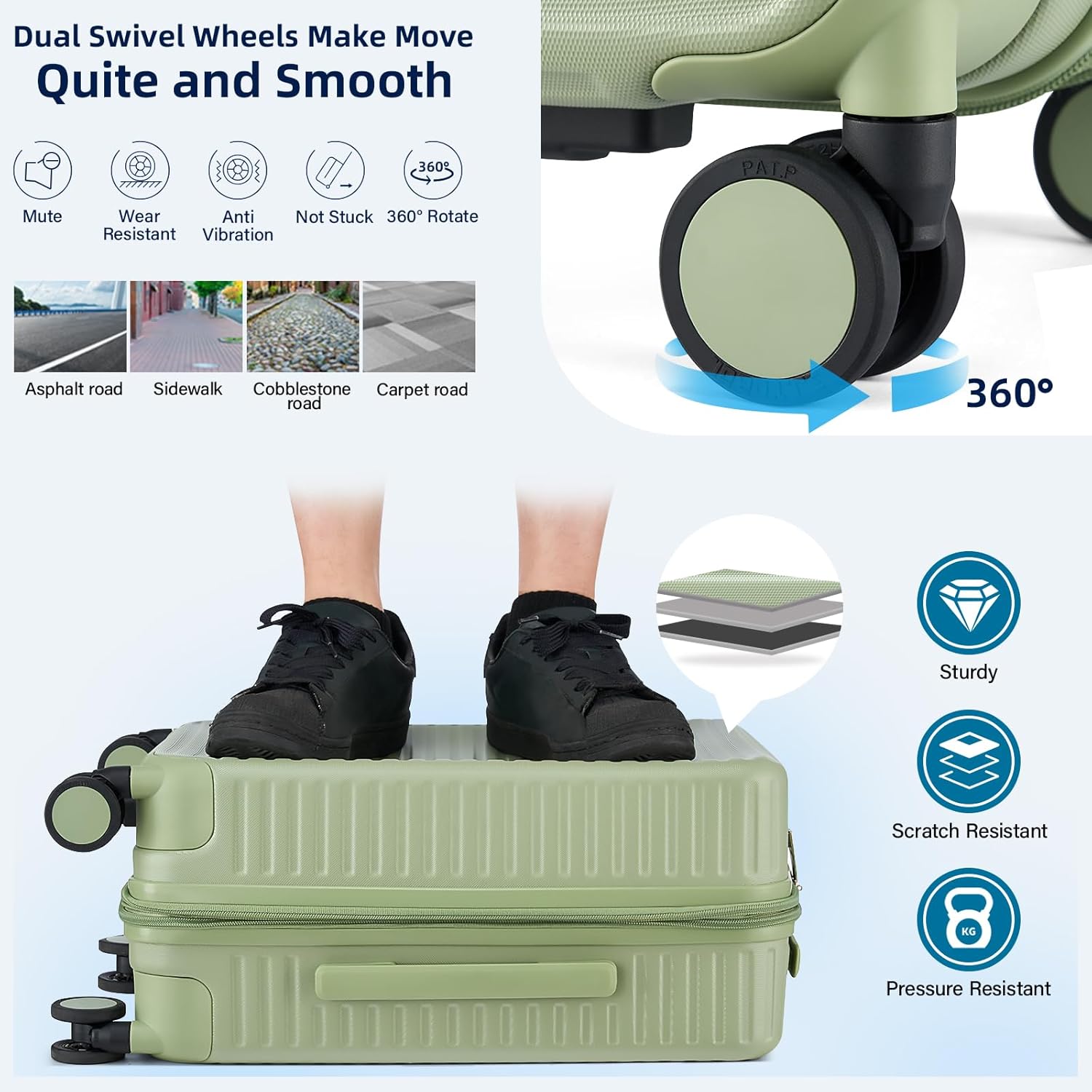 Hard Shell Suitcases Expandable Travel Luggage Sets 2 Piece, Carry on and Check in Luggage Lightweight Suitcase Set 2 Piece with Wheels Cup Holder Charger Built in (Bamboo Green, 20/28)