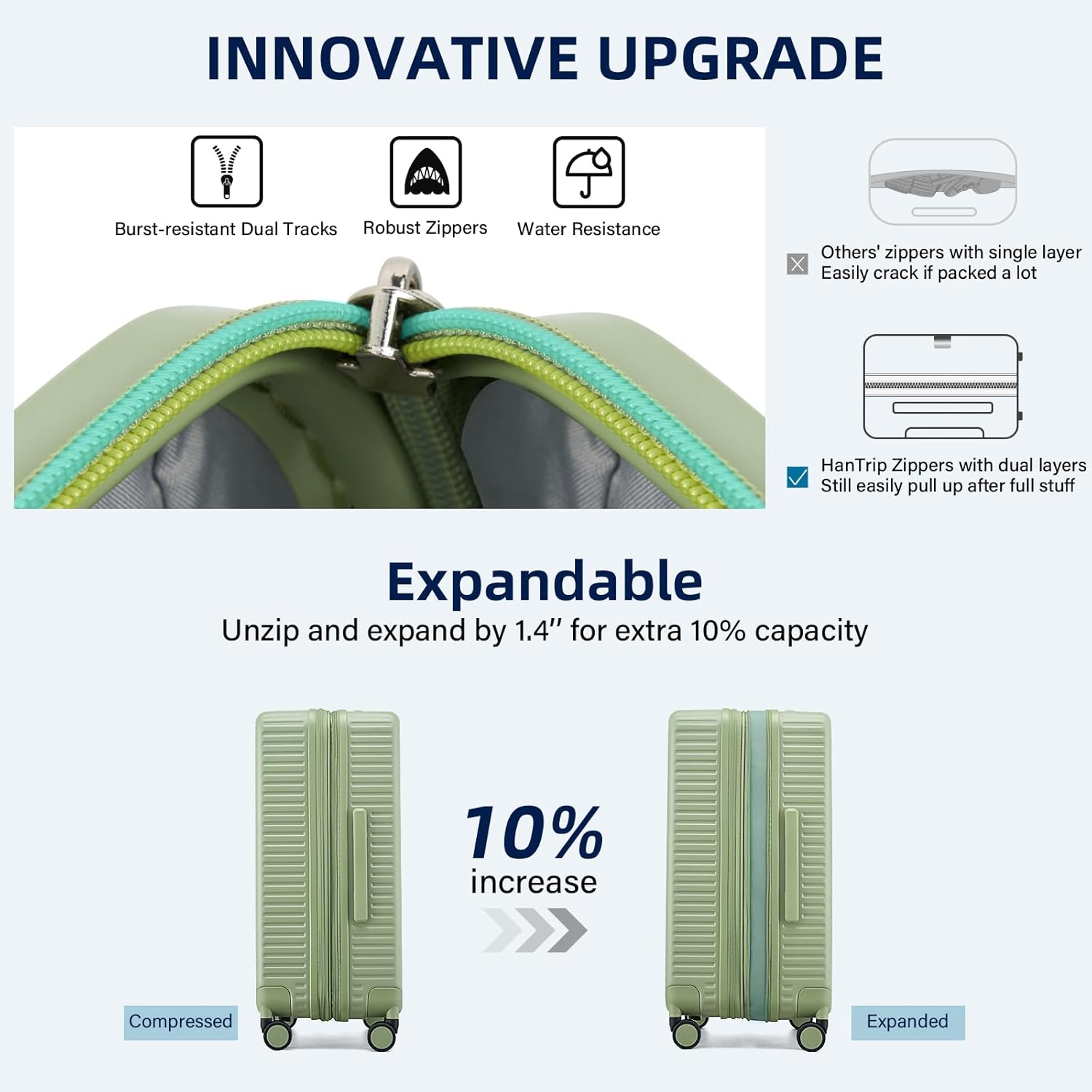 - 【Expandable Luggage Maximized Space】HanTrip two piece luggage set with spinner wheels, suitcases of both sizes boast a built-in power bank pocket, a wet / dry seperate zone and 2 big compartments, large capacity for over 10 days’ personal items and travel essentials. For extra room, just unzippper and expand the suitcases by 10% space. Excellent durable luggage set for travelers of large capacity demand.