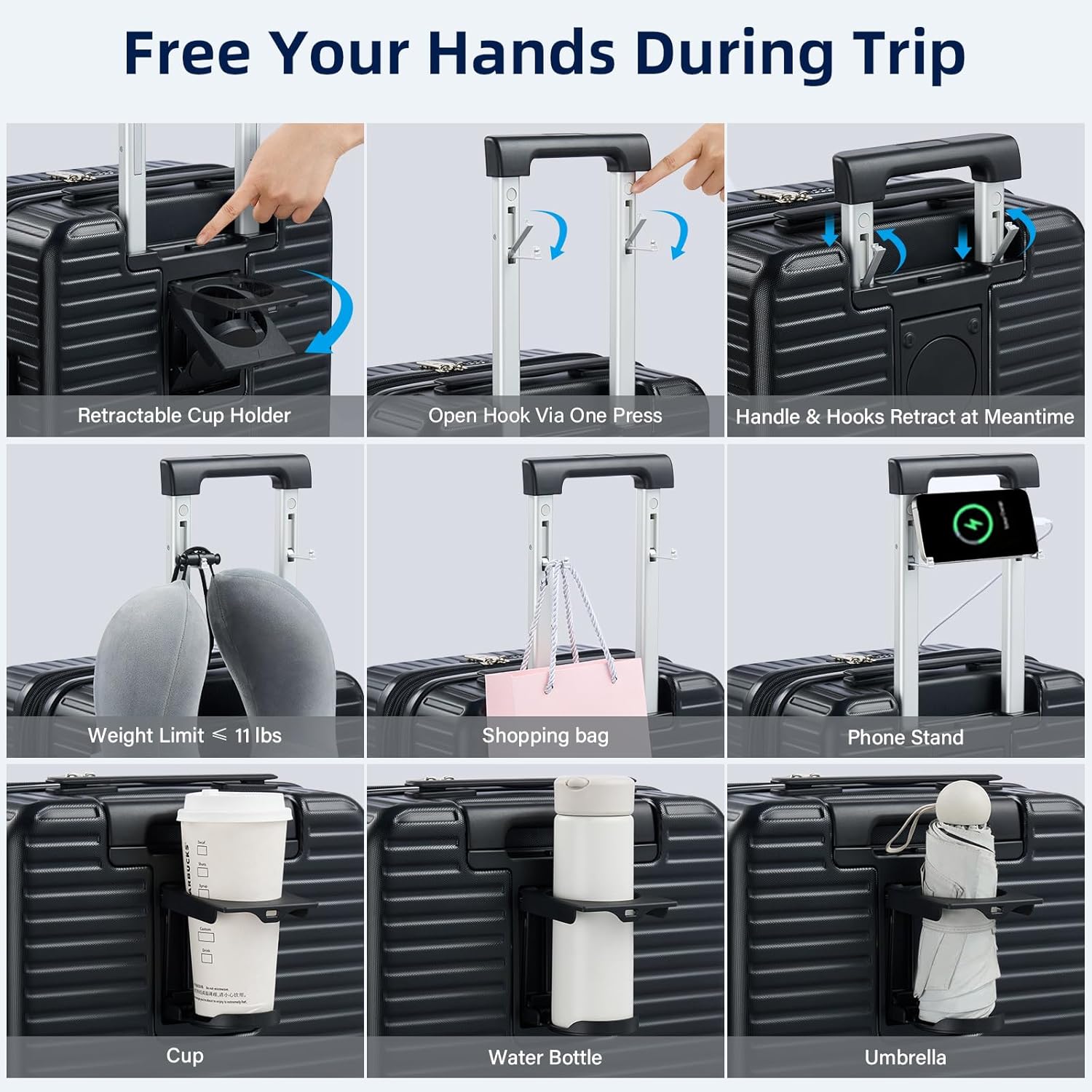 - 【Cup / Phone Holders & 2 Charging Ports】Large suitcases with wheels feature a universal cup holder for most water bottles, coffee mugs and tumblers. Retractable dual hooks securely hold various persoanl items like phone, iPad, U-shape throw pillow, handbag, etc (up to 11 lbs). Built-in charging ports allow on-the-go power access for Type-C / USB devices (portable power bank not included). Multifuncational black luggage to set your hands free during layover at airport / train station.