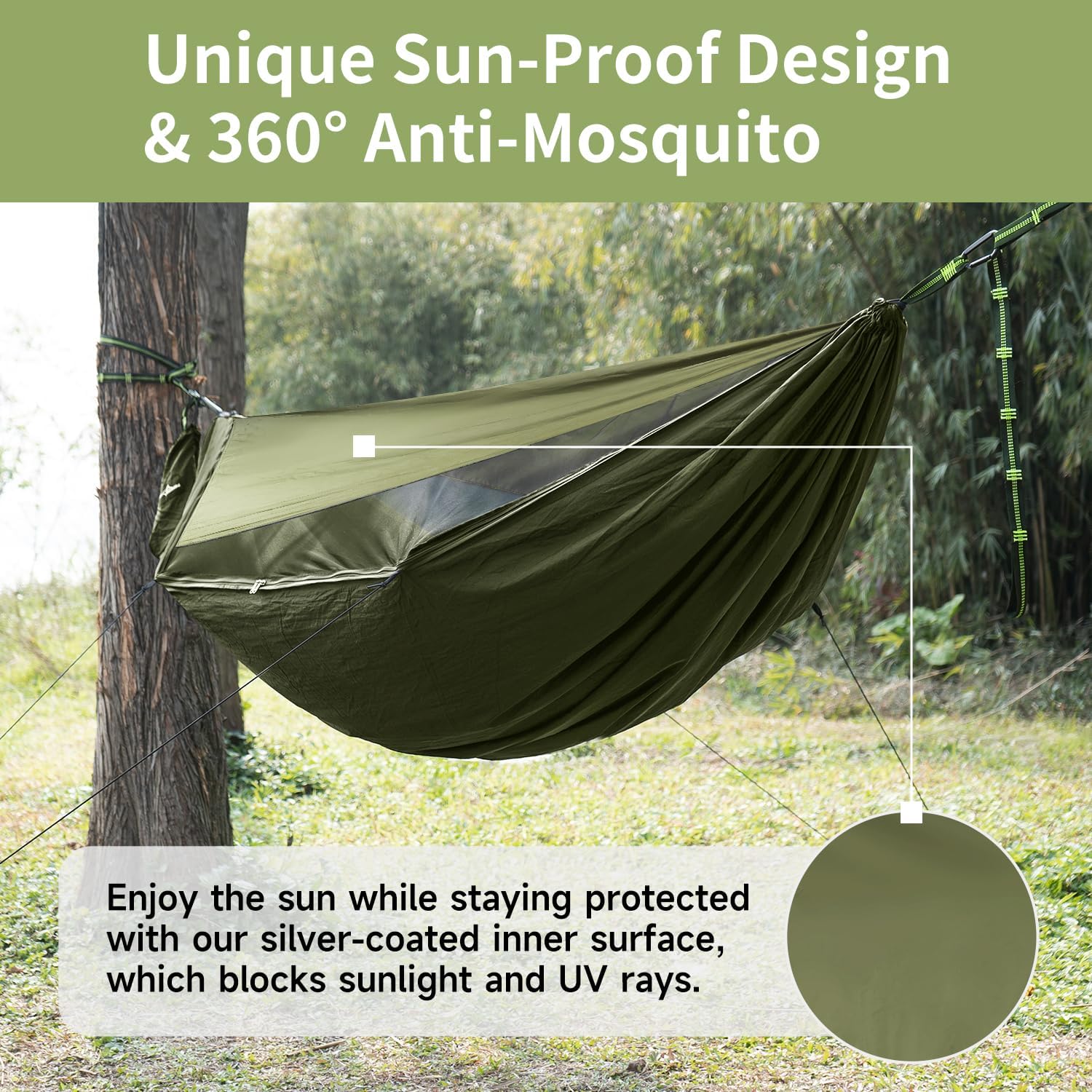 - 【Unique Sun-proof Design & 360° Anti-Mosquito】Boasts an integrated sunshade with a silver-coated interior for superior UV and sunlight protection. Stay cool under the sun while the reflective layer keeps you safe. Enjoy bug-free lounging with the built-in mosquito net—breathable mesh blocks even tiny insects while maintaining airflow. Unzip the net effortlessly for a spacious hammock setup.