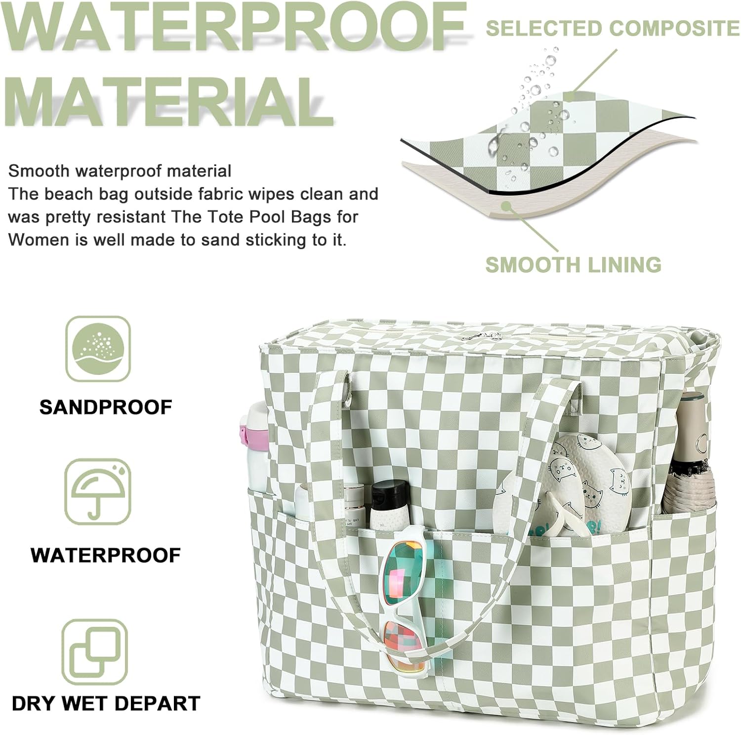 - Waterproof sandproof beach bag has tons of pockets and space for your towels, swim suits, flip flops, water bottles, glasses, sunblock, toys and any other things you'd like to take with you to the beach or pool, and interior pocket to place keys, your wallet or phone and other valuables