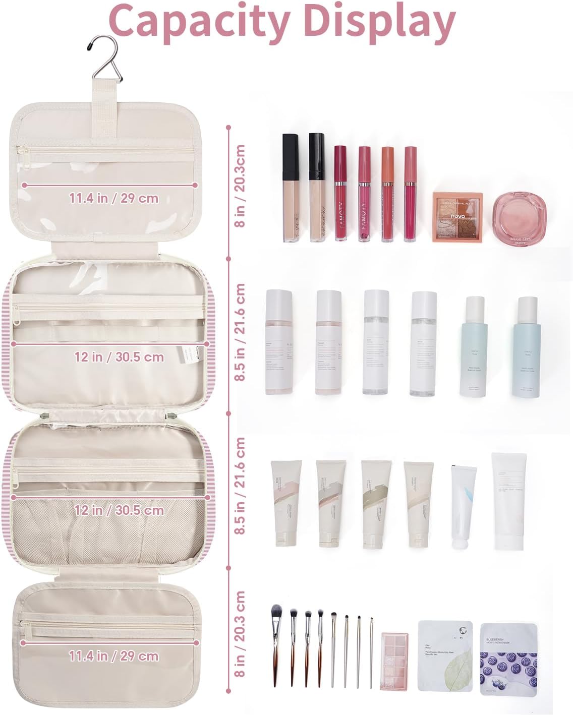 - LARGE VERSION - Fold size 12"x9"x5.5”/30.5x22x13 cm. We launch larger version to meet large-capacity, which you may choose large or medium size based on your needs. It could easily fit full-size travel essentials like shampoo & conditioner, lotion, face wash, toothpaste, toothbrushes, hair brush and daily makeups