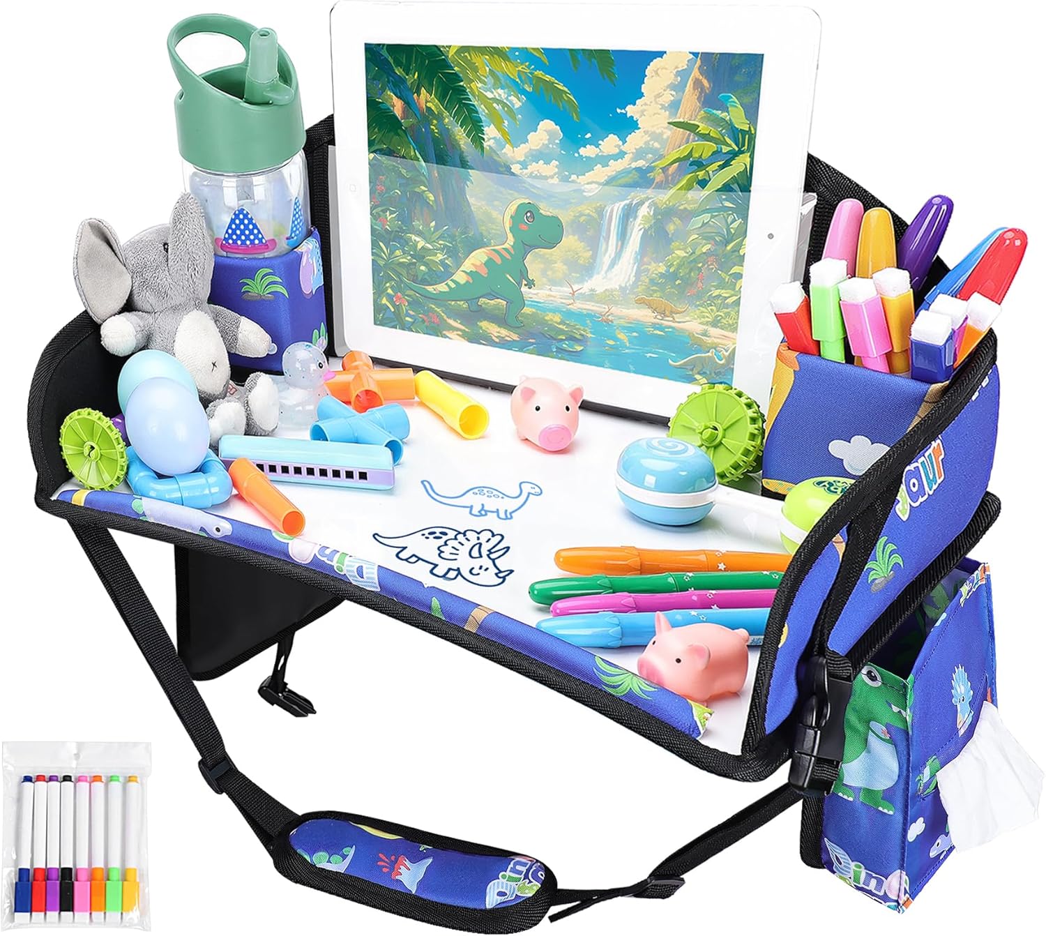 Kids Travel Tray for Airplane - Toddler Car Seat Table Tray, Road Trip Essentials for Boys & Girls, Carseat Lap Desk for Kids Road Trip Activities,Blue Dinosaur