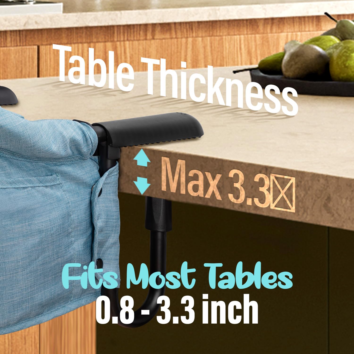 - 【Easy to Use and Install】This hook on chair can be used with most types of tables between 0.8 inches and 3.3 inches (20-85 mm) thick,compatible with most tabletops and can be attached quickly and easily, making mealtime a breeze for parents