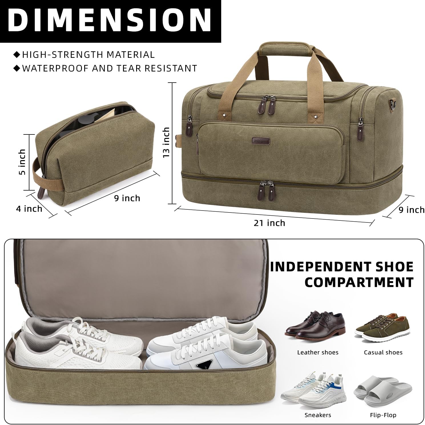 ZOMFELT Duffle Bag for travel, 40L Canvas Travel Duffel Bags for Men Women, Water Resistant Overnight Weekender Bag with Toiletry Bag & Shoe Compartment, Carry on Luggage Bag for Travel, Gym, Green