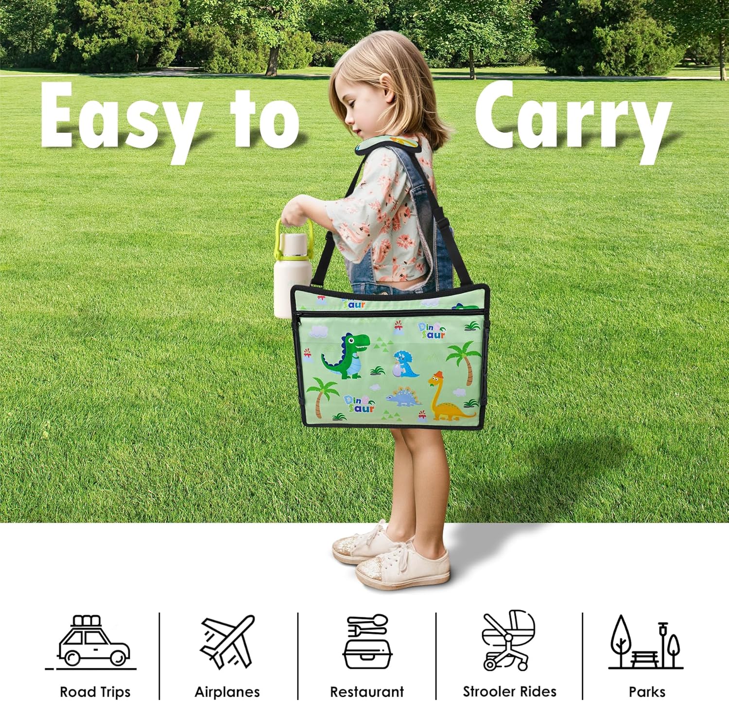 Kids Travel Tray, Kids Travel Trays for Car Seat, Road Trip Essentials for Toddler, Carseat Lap Tray with Dry Erase Board & Storage Organizer for Road Trip Activities for Kid, Green
