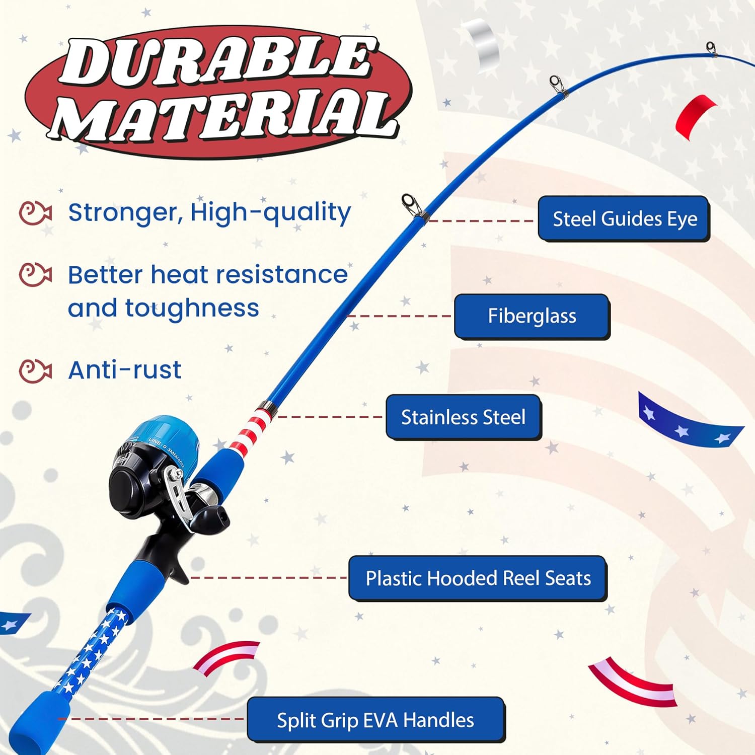 - BEST VALUE PATRIOTIC KIDS FISHING GEAR: Reel in freedom's spirit with every cast. Crafted with bold patriotic colors and iconic star-and-stripes detailing, our kids fishing pole is a mini tribute to American spirit. This Independence Day, don't just watch fireworks and parades. Take your children into nature and experience the joy of fishing!