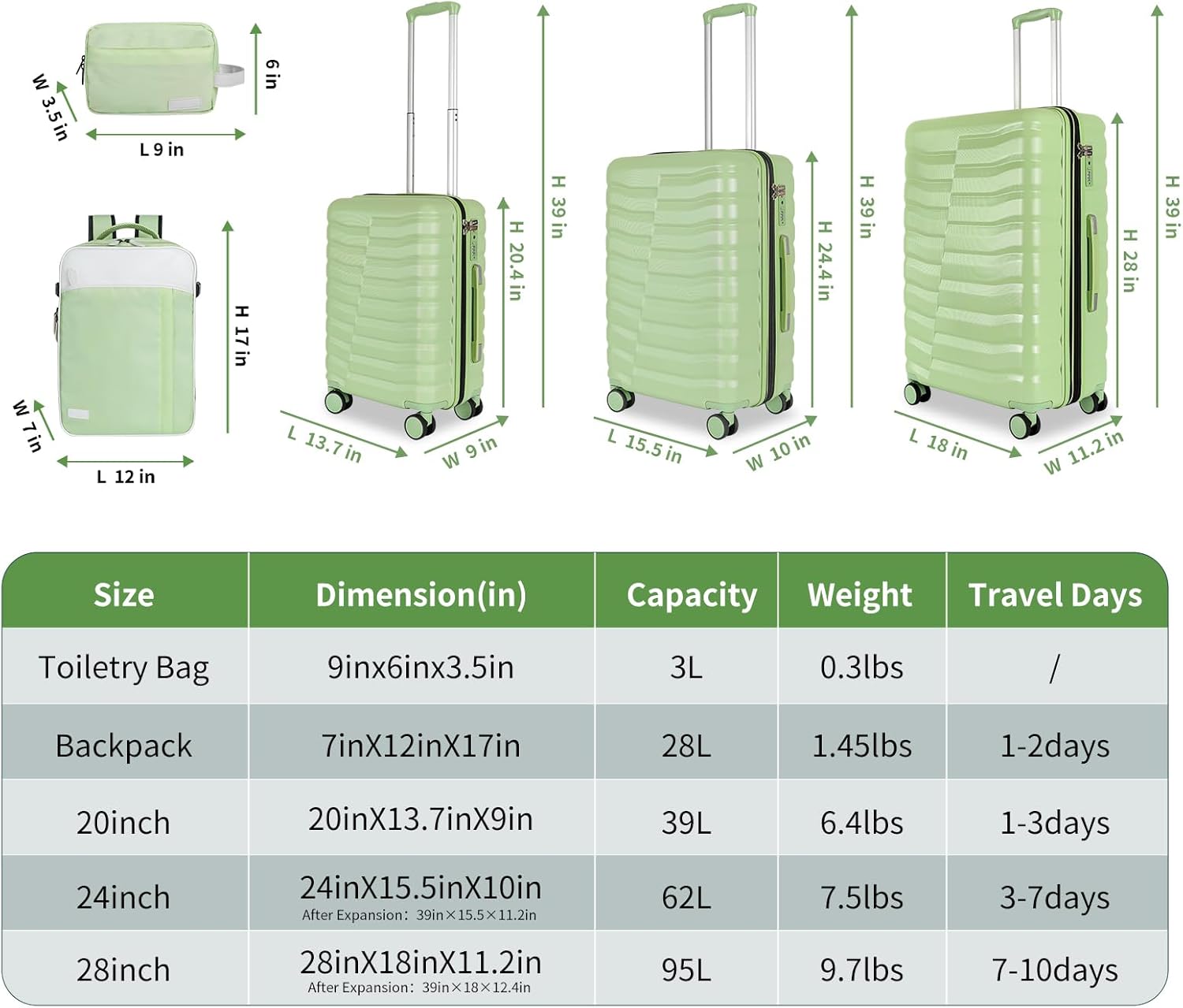- 5 Piece Set: Set contains a carry-on 20" luggage, a 24" checked suitcase, and a 28" large luggage, a backpack, a toiletry bag and three luggage tags. Specifically designed for 24 and 28 inch luggage, the extension layer adds more capacity to maximize your packaging capacity.